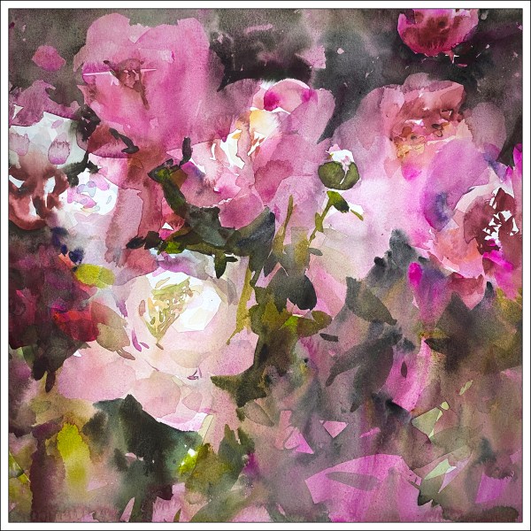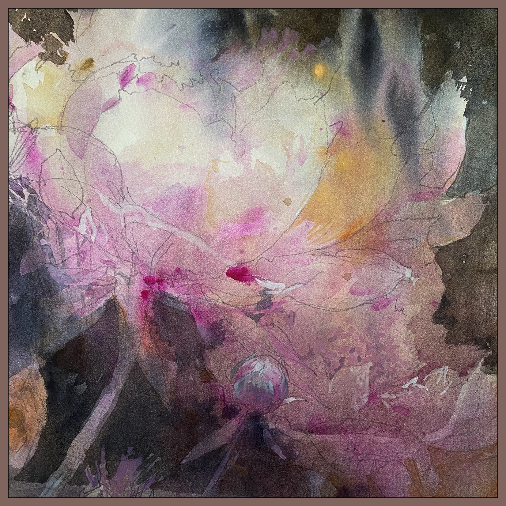 “Peony Season”, 22×22″ Watercolor on Fabriano Artistico 200lb Cotton Rag.