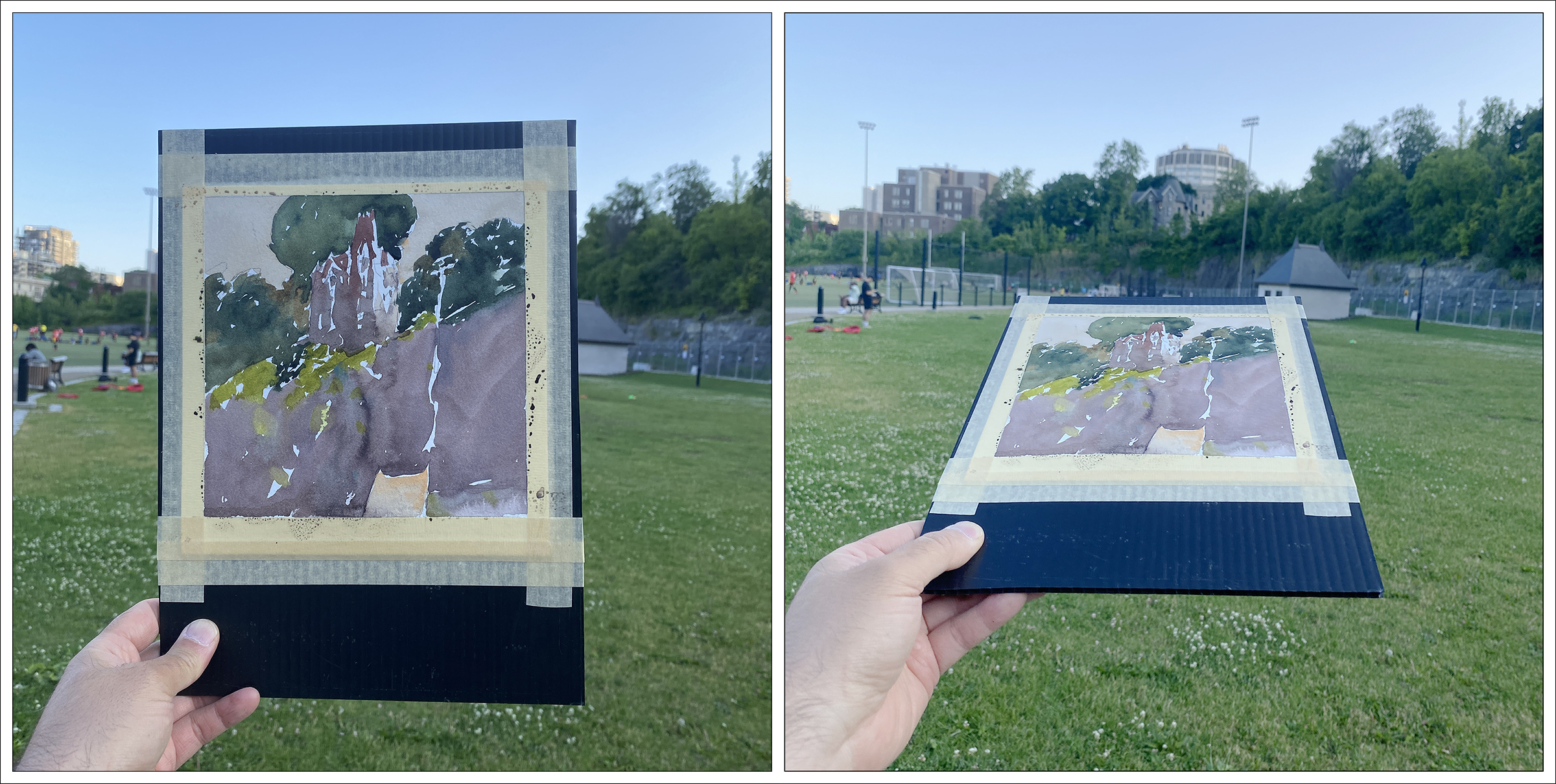I had to learn from a book that drying was a necessary step for Tea, Milk, and Honey; but even then, when you’re painting plein-air you’re doing well if you have time to wait for one soaking of the paper, never mind all this layering.
