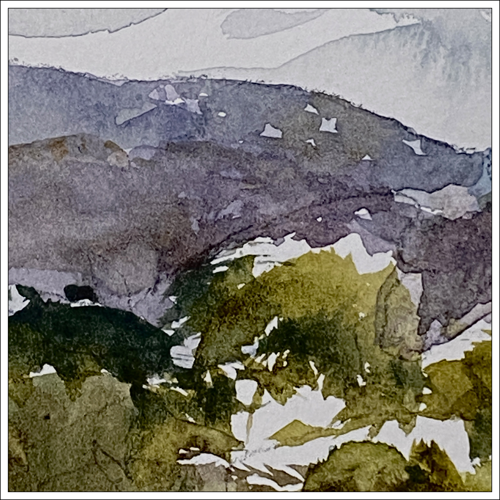 I did also tweak this little white hook on the left (white gouache!) to suggest that it might visually join the larger white blob on the right, and give the impression there is a distant lake behind the hill.