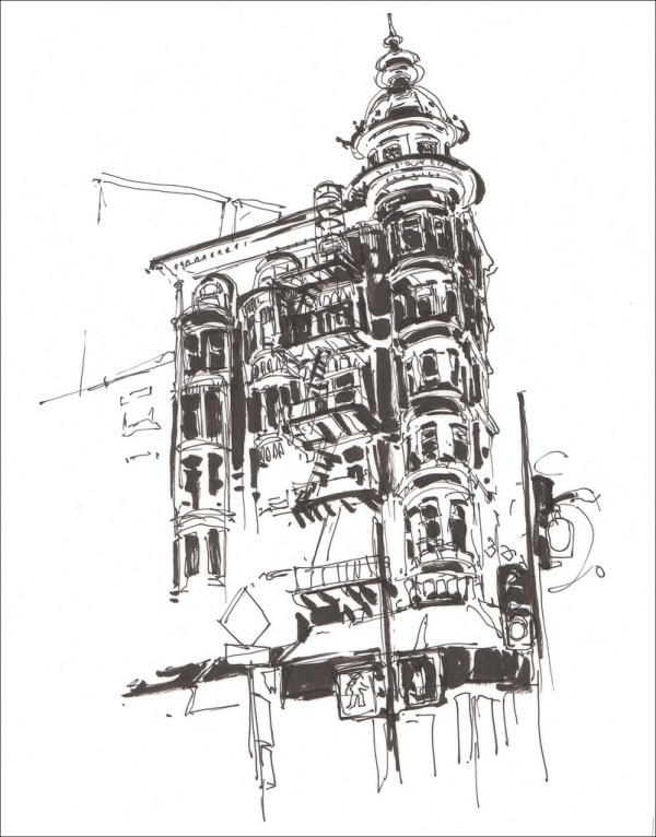 Needs more demons. I wish sacramento was as interesting to draw as frisco =\ “Hay look another square building!!” Keep up the sketchin.