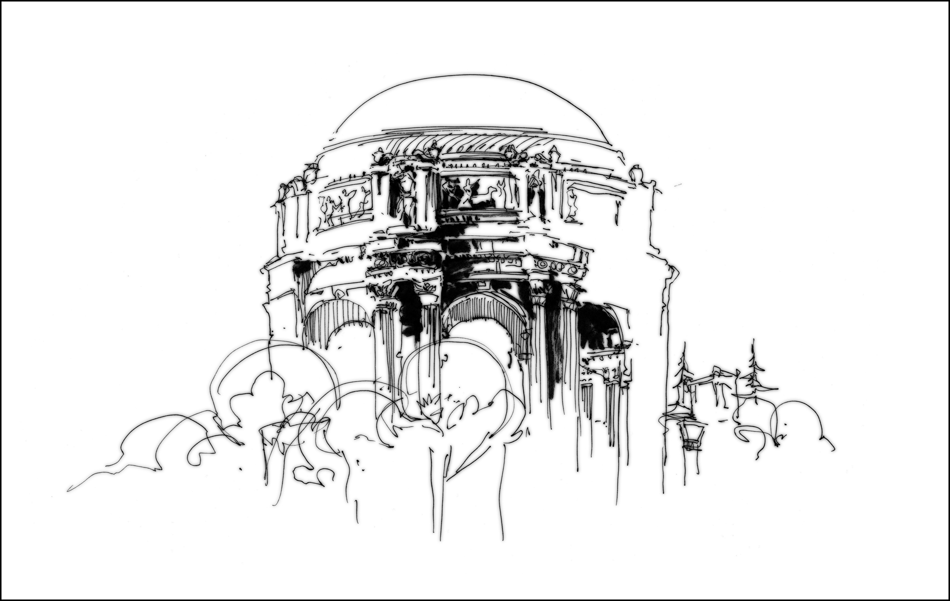 The monumental dome at the Palace of Fine Arts (one of the architectural highlights of San Francisco). The place is fairly bristling with the overblown gothic detailing I love to draw.