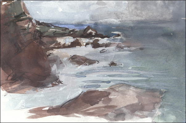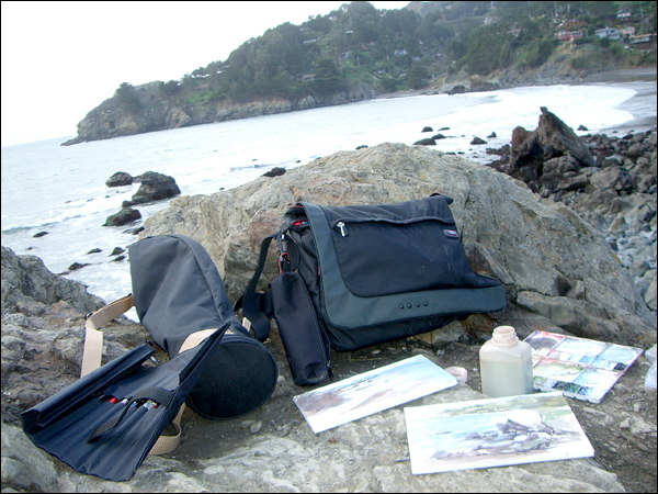 Cold and rainy today – so of course we decide to go sketching :) Rumor has it you can’t find a parking spot at Muir Beach anytime after 10AM on a normal weekend – so I thought we’d take advantage of the unreliable weather. Turned out to be a great day for it. No crowds, and an interesting overcast foggy feeling that seems typical of NorCal winter.