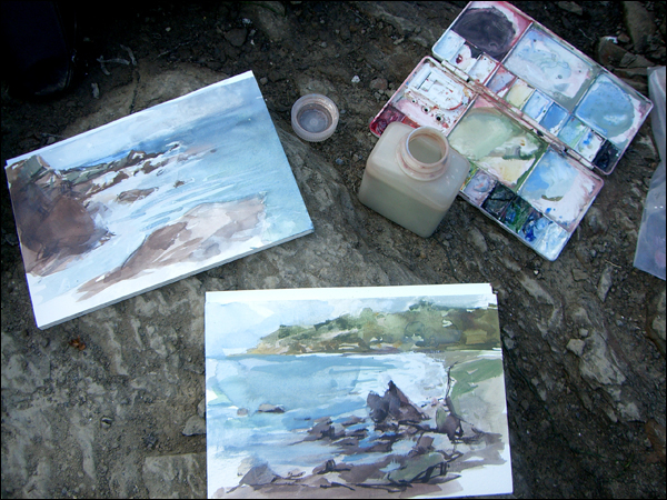 I ordered a fancy-schmancy watercolor easel – but it hasn’t arrived yet – so I’ve reverted to sitting in the dirt. (well, ok, on a camping stool). On a day like this, it’s easier to just spread your stuff on the ground. You don’t have to worry about your easel blowing over.