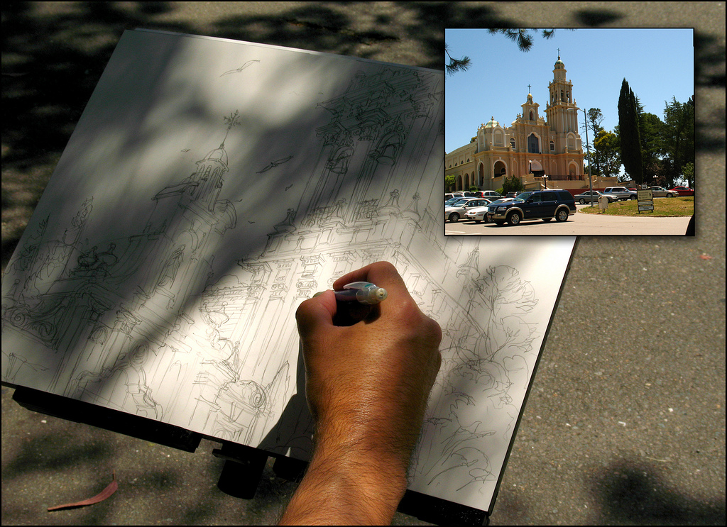 It had to be around 90 degrees yesterday. As I was drawing, my shady spot was swiftly shrinking – but the light on the buildings was improving :) I stuck around long enough to entirely overwork the right side of this sketch. S0 – here it is, cropped to the more interesting area :)