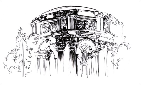 Our drive home from the city takes us past the Palace of Fine Arts – which we’ve drawn many times during the day.