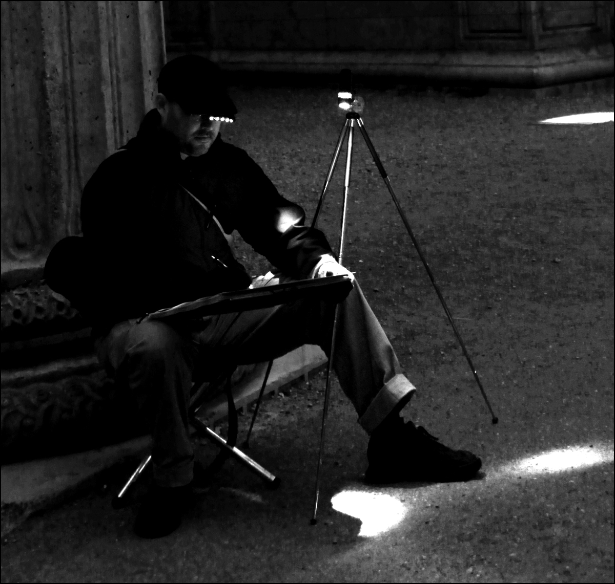 Here’s a snapshot of my new night drawing setup. An LED bike light taped to an ultralight tripod, and a fisherman’s ‘ball cap light’ clipped to my hat brim…makes drawing in places without streetlight a lot easier. Added bonus – it makes raccoon eyes glow green. A little creepy at first.