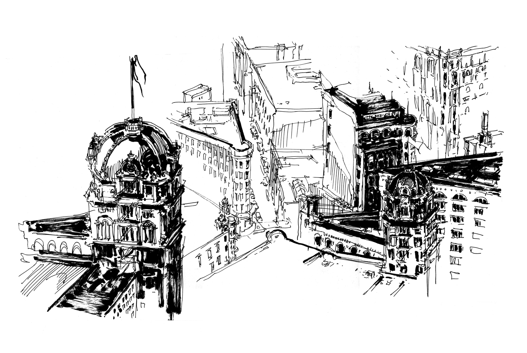 Sketching from the View Lounge, high atop the Marriott on Fourth Street, between Market and Mission. Open from 4pm – you can see a panoramic view of the city and bay bridge. I prefer the effect of the streetlight after dark. I can’t recall who built that building with the dome (drawn twice in this sketch) – some old banking fortress. It was one of the first things I drew in SF (from the ground). It’s interesting to come back to it 3 years later and get it from the air.