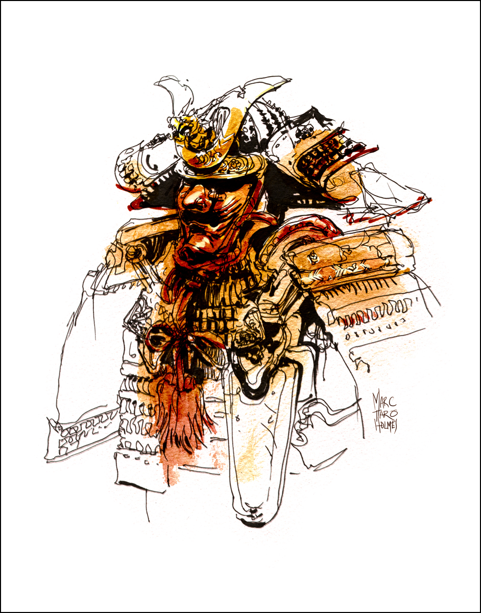 However! cold dark winters are a good time to go back into the sketchbooks. Here’s a couple more experiments with digital watercolors. I’ve had these two old favorites pulled out for a while now. Been wanting to do something with them for ages. The drawings were done at the Asian Art Museum in San Francisco a few years back. This was a traveling show, so you won’t find these suits of armor there now, but the permanent collection is well worth a drawing trip on its own.