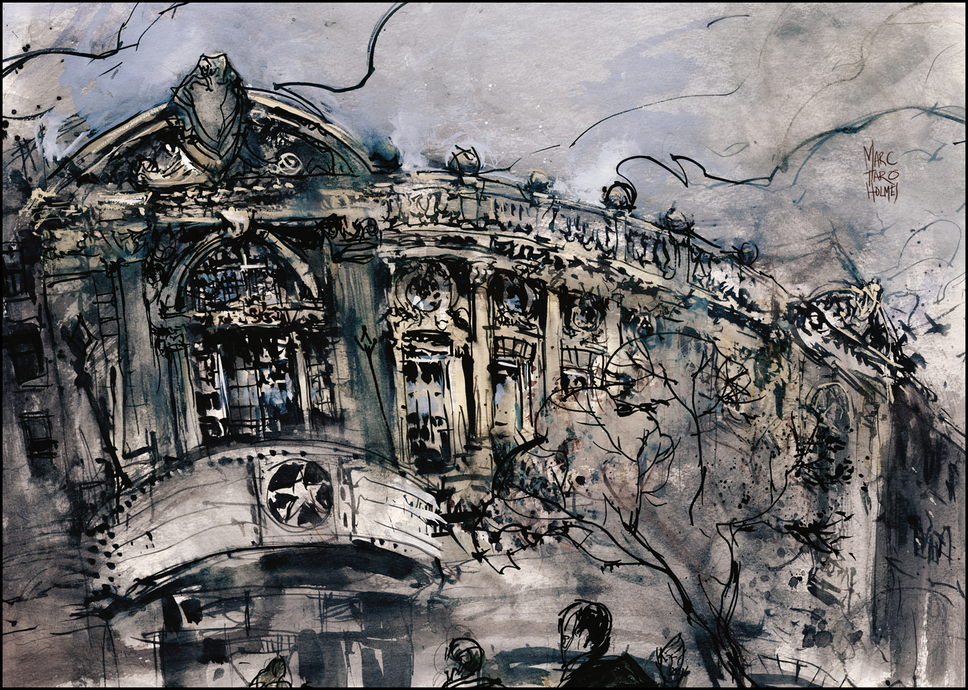I know! How about a really aggressive line drawing in ink – I won’t even worry about perspective, this will be really cool!