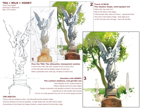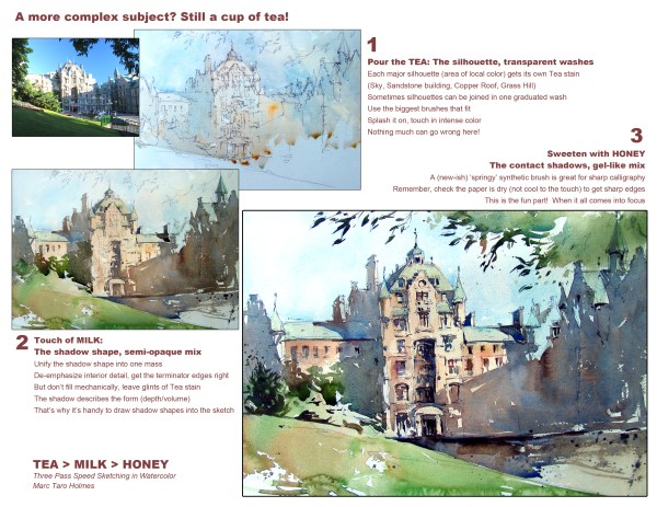 I absolutely love your “Tea, Milk, Honey” notes on watercolor from the July 2012 issue of Citizen Sketcher. I absolutely love watercolor but am perplexed at staining, transparent, opaque, and semi-opaque colors. There’s so much to consider when you’re under the clock (drying sun). I’ve heard of the “tea” and “cream” analogy made by Joseph Zbukvic. I also own Jeanne Dobie’s book Making Color Sing that sheds some light on the subject of transparent colors. I think I get what you mean by applying the area of local color during the tea stages.