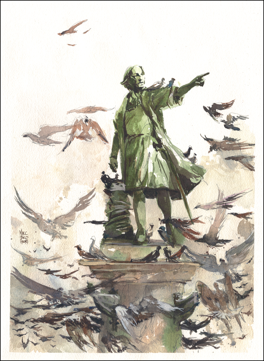 Veronica (in her workshop Decisive Moments) had asked us to do thumbnails of various storytelling moments all around the Parque Colón. Out of all the sketches, the image that stuck with me was the huge cloud of pigeons orbiting around the statue of Columbus.