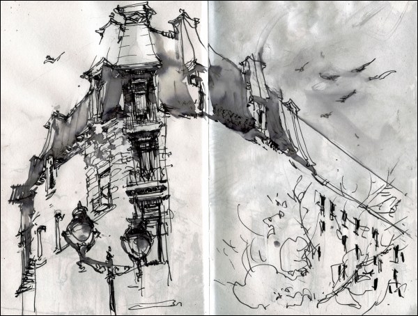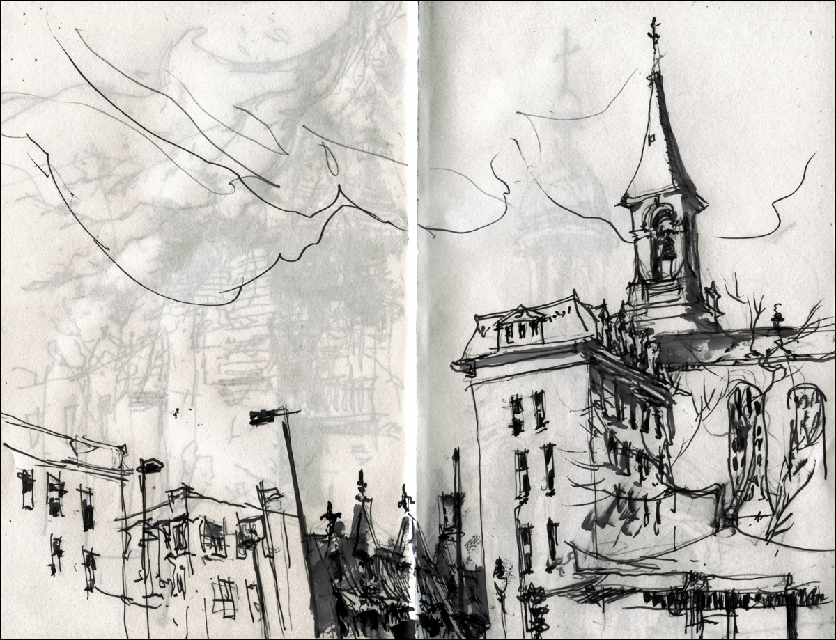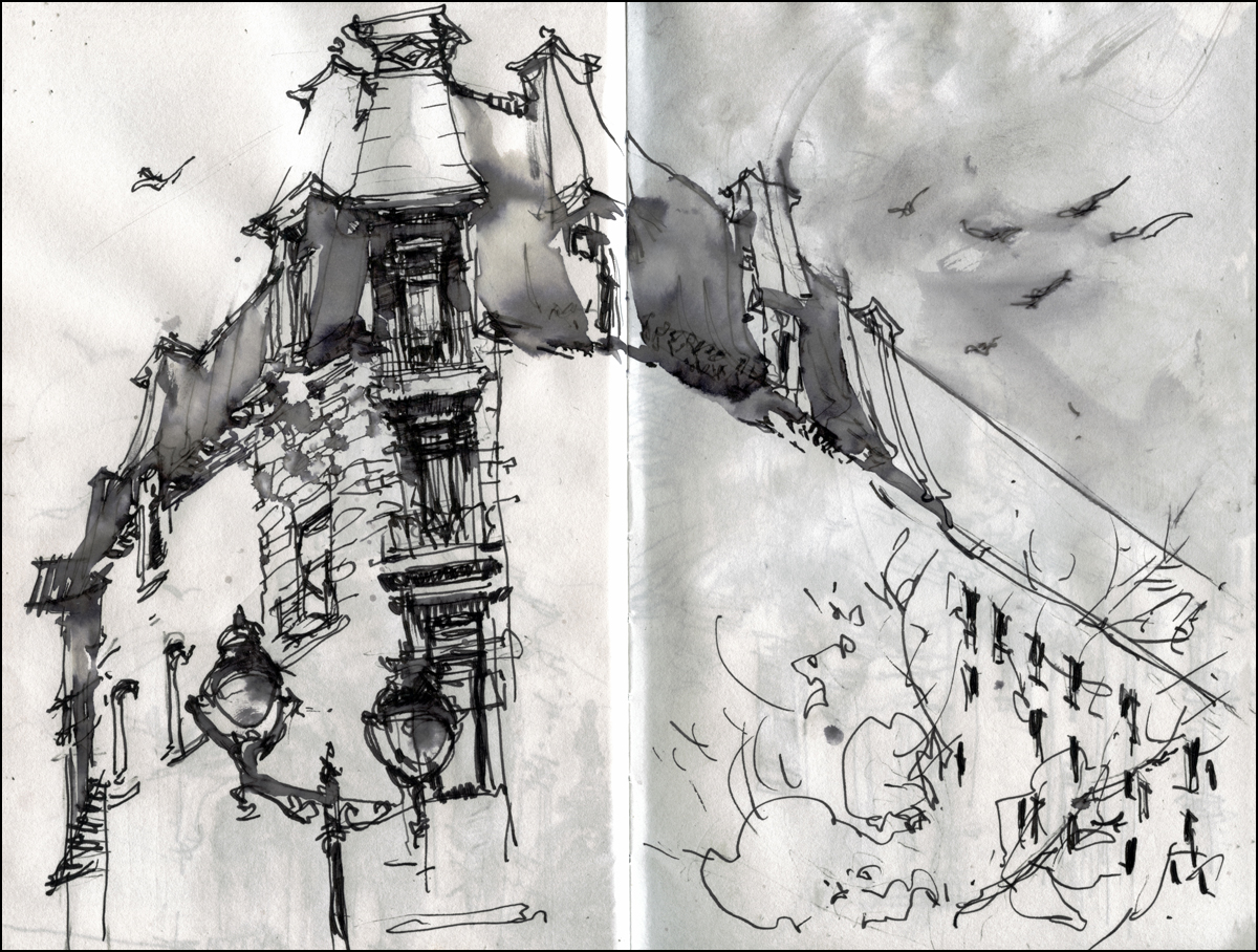 In a weird way, I like how this cheap book I had bleeds through. I sort of enhanced that in the scanning process. It’s not something you’d use for a serious drawing, but for these Lamy and water-brush sketches the effect is kind of neat. I was traveling super light gear wise – so these are ink-washed with diet pepsi.