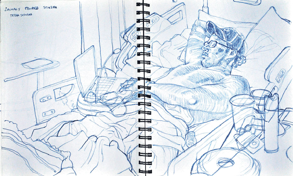 [Sergeant Zack Stinson lost both of his legs and portions of both arms to an IED in Helmand Province, Afghanistan. Sketched at his bedside at a veterans hospital in Virginia, February, 2010]
