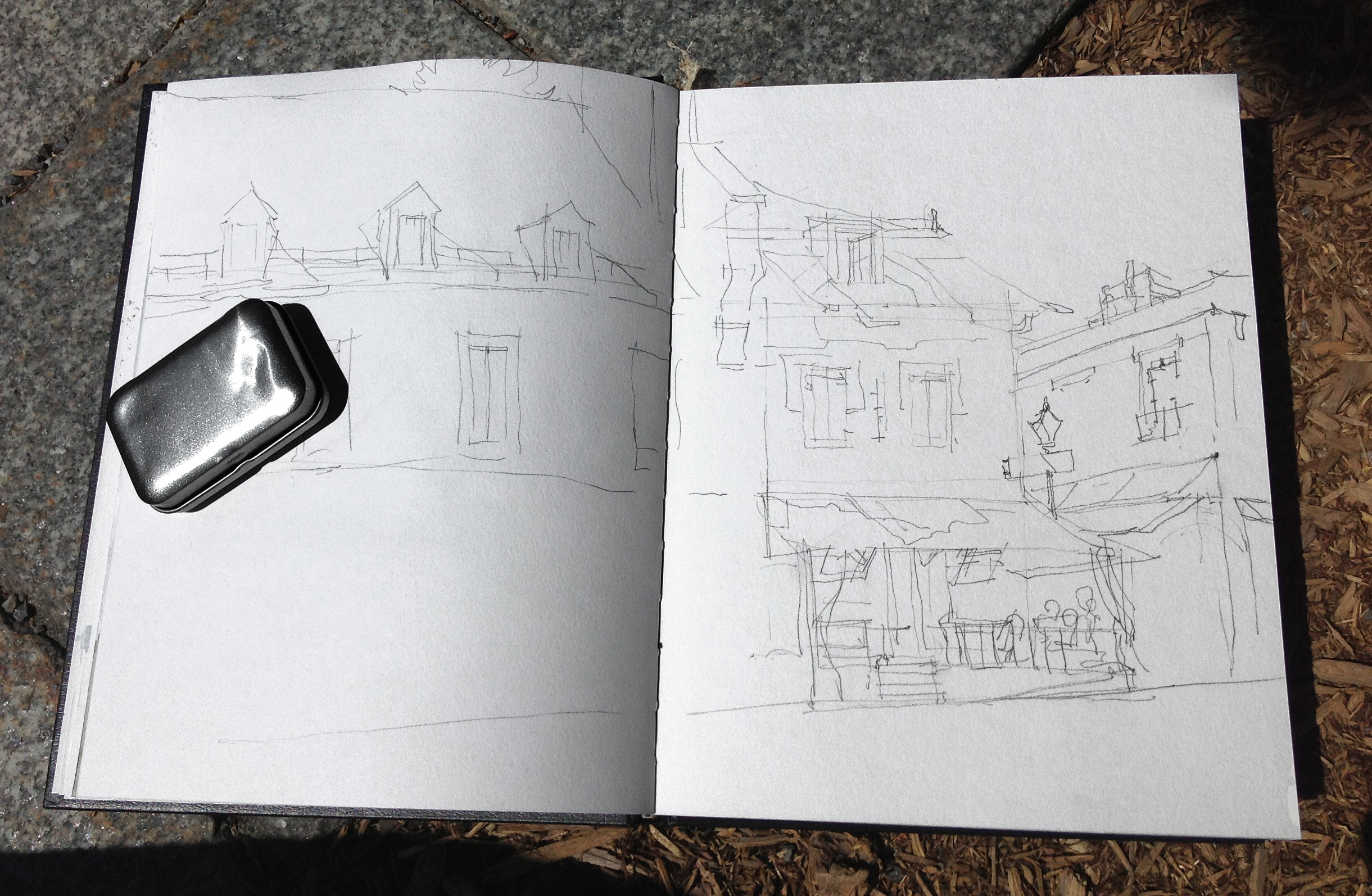 Clearly, I don’t want the truck in my sketch :)  that’s easy. But also I see immediately that the yellow awning and cafe below it is the interesting part of this view.  Not the people setting up their booth. Not the larger building, but the smaller one.