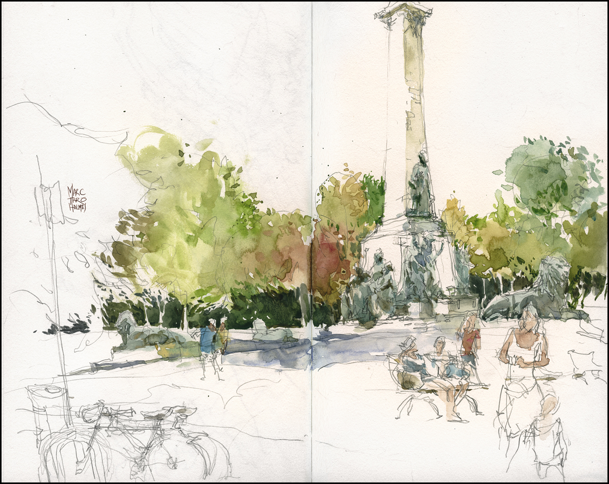 Just back from the USK:MTL outing to Mount Royal Park. I started with our Angel-on-a-stick (properly called the George-Étienne Cartier Monument) while waiting for the Tam Tams to get going. (Every weekend in Montreal they do a drum circle onomatopoeiclly named ‘the Tam Tams”). I’m thinking, this is cool – sketching with a sound track – I’ll enjoy this for a while. But by the time I get my act together to go sketch the musicians there’s a HUGE crowd gathered. No doubt it has something to with the pretty girls belly dancing. So – no way I can get a good view. After being rained out of at least two tries at sketching Tam Tams – I’m still going to have to back!