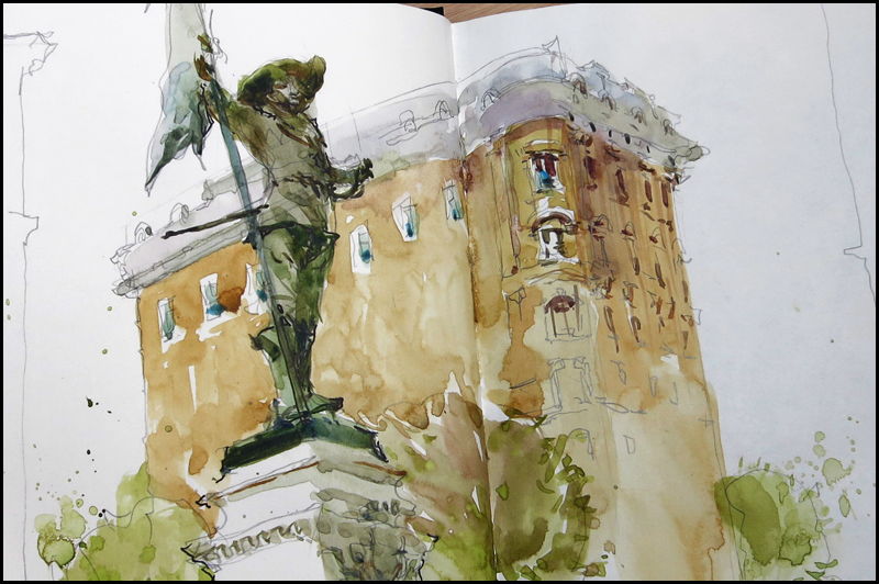 I was down at Place d’Armes today, scouting for a good angle for my demo in August, and dry-running my ultra-small sketching kit for BCN. This is a little 5×8 S&B sketchbook. It’ll be great to get down here with a full watercolor kit!