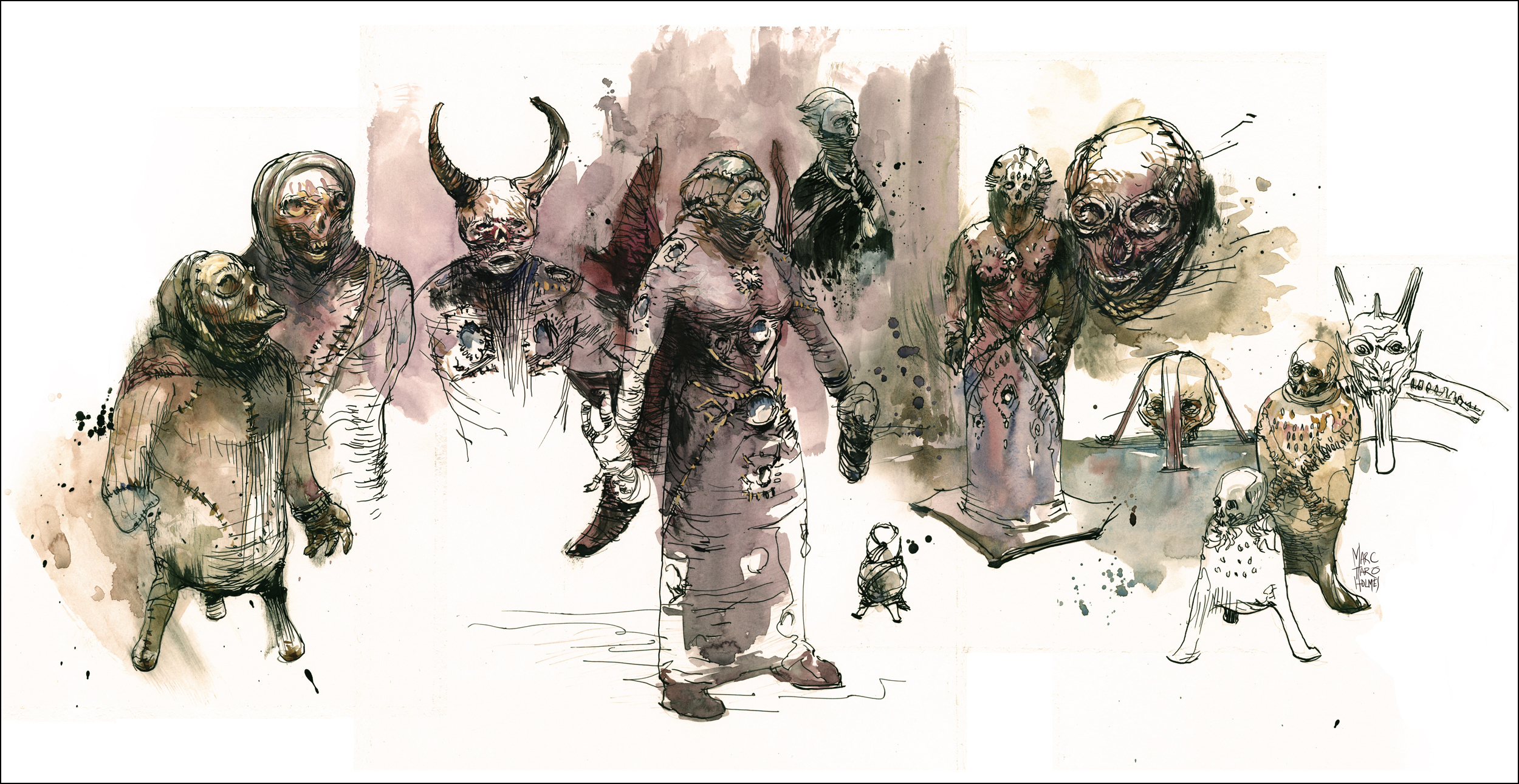 Many of them seem to be crudely stitched from canvas or leather of some kind. Most are painted in drips of blood red and some kind of dark waxy streaks. They range between two and five feet tall. Many sprout horns or bat wings and carry weapons – swords, spears, clubs. The scars of their seams, lashed with careless stitching can’t help but suggest an autopsy, or perhaps Dr. Frankenstein’s handiwork.
