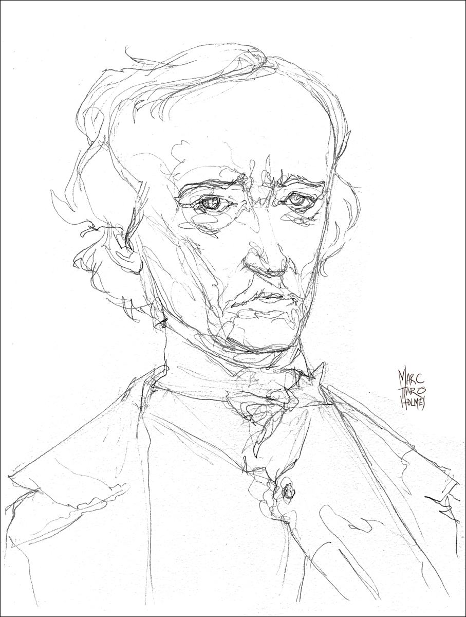 I should say, I don’t consider myself a portraitist, in the sense that I prefer to draw my idea of a person, rather than a dead-on likeness. So you’ll forgive some exaggeration in his physiognomy.  I want to capture the barely contained churning thoughts roiling in his stately dome. And that pale sickly complexion that hints at his upcoming descent into the drugs and madness which ended October 7th, 1849, the day of his inadequately explained death.