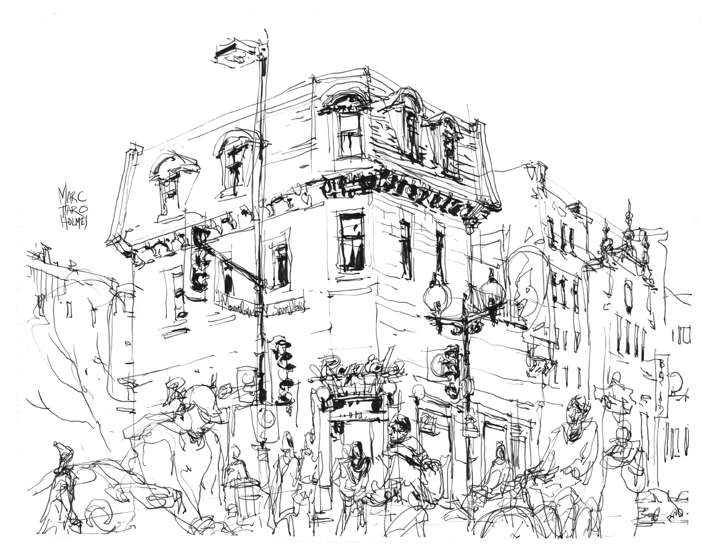 Went out sketching the other day with the MTL:USK group. Brought two watersoluble pens to the Mount Royal Plateau. My new Lamy Safari Extra Fine, and equally new Kuretake #13 brush pen. (Jetpens.com) I swapped out my usual Pentel Pocket Brush, in favor of the Kuretake, to enjoy the water-soluble properties of their cartridges. Here’s some lines, followed by clear water melting. It’s a neat magic trick. World’s most convenient watercolor kit.