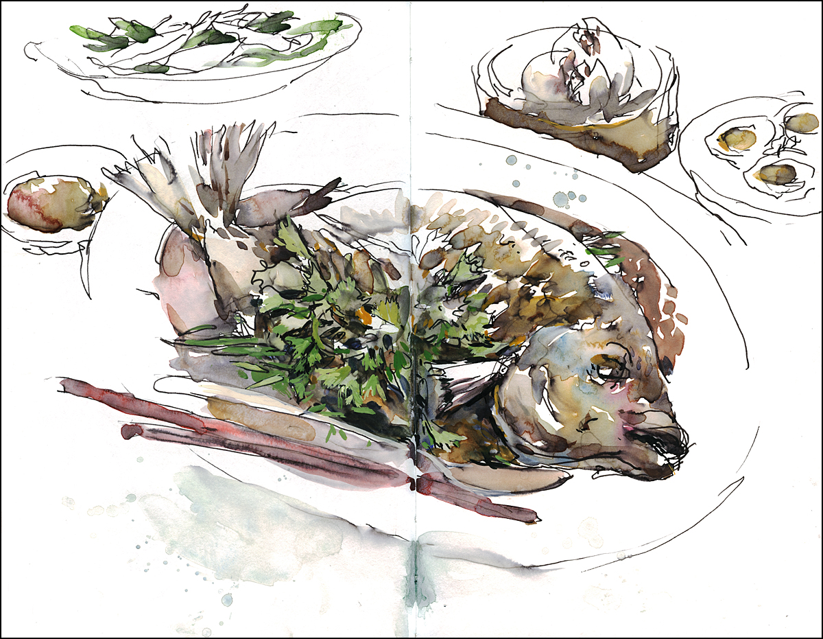 The main sketching course was a whole Tilapia with it’s guts stuffed with cilantro and shallots. Yummy, and interesting to sketch. I hear Tilapia is not supposed to be the healthiest fish, but I couldn’t complain. Good eating!