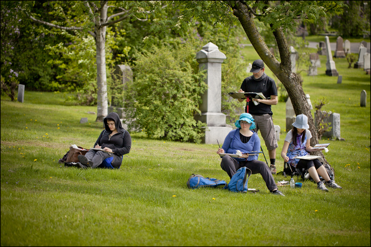 In the afternoon some of us headed to the other side of the mountain to sketch in the Mont Royal Cemetery. Always a favorite place to draw. I don’t know what got into me – there was a weepy angel just to the right of my composition, and I left her out! It’s so unlike me not to paint a gothic statue given the opportunity. But today was sort of a landscape compositions day and she just didn’t fit in. I was too interested in these stone sepulchers half buried in the side of the mountain.