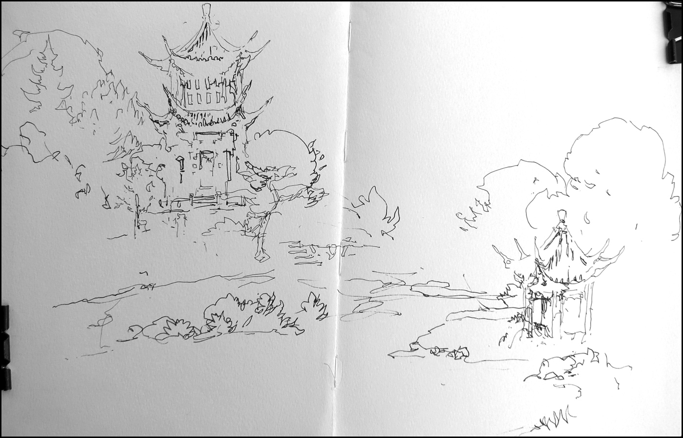Just back from sketching with Urban Sketchers Montreal. Here’s my morning drawing from the Chinese pavilion at Montreal’s Jardin Botanique.
