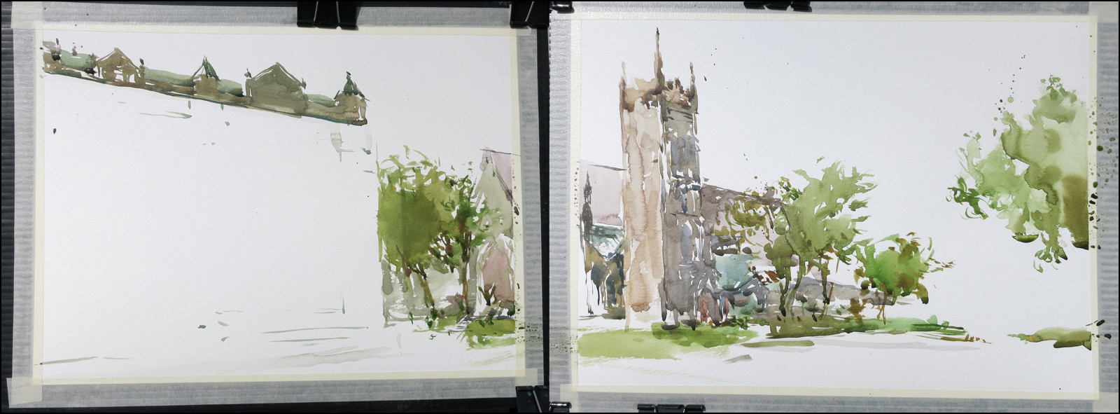 I try to make each of the shapes I’ve identified with one continuous bead. Carrying a wash down the bell tower, stopping at a logical spot along the ground line. Or working across the roof line of the train station, infusing the whole shape with the grey-green tone of copper cladding. This gives the puzzle pieces an internal unity of color, and sharp edges between plane changes. Where you stop an edge is just as important as where you start.