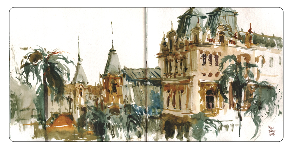 Wonderful representation of the richness of the architecture. Did you really do these with no pencil contour drawings , and btw where did you get square format hard bound sketch book?