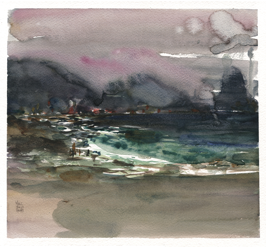 This last one, a fun experiment. We were walking back from a long day sketching, and Linda Permann dared us to sketch one more – on the beach, in a puddle of streetlight, looking at the dark water. Isn’t that awesome? Sketching buddies that won’t quit, even when the sun goes down. I honestly had no idea if this was possible, so I’m quite happy with the way it turned out.