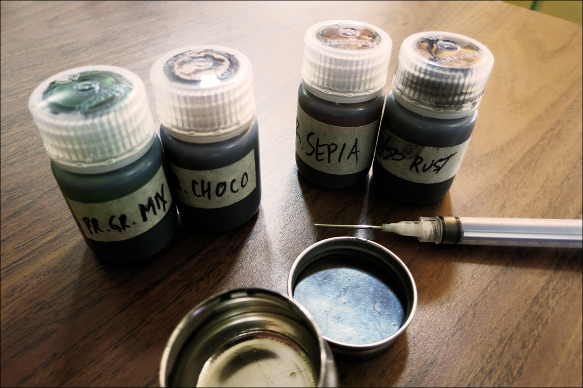 Shown here: 1 oz (30ml) Nalgene jars (leakproof). Syringe with large bore needle for measuring out ink mixes. ‘Clip-on’ oil painters medium tin that can go right onto a sketchbook or drawing board. I have four of them, from the Guerilla Paintbox brand – these have a rubber seal to prevent leaks.