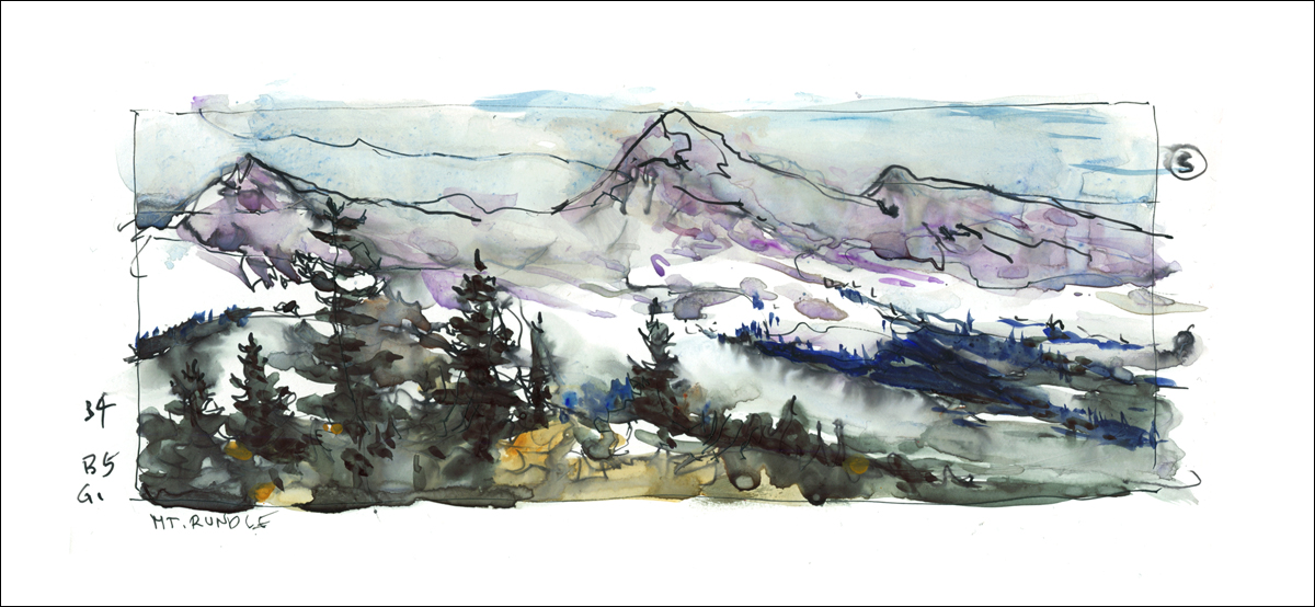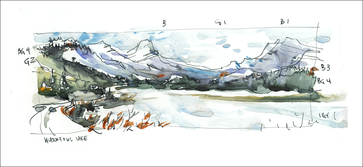 Did you notice the margin notes – the small letters and numbers? Those are color and value notes (on a 5 value scale). I did all the sketches as time allowed – working quickly, being ready to move when Laurel was done shooting. I ended up painting in the car during the long drive, but in the past I’ve come back for color in the evenings. If I don’t do it the same day, I rarely get back to it.