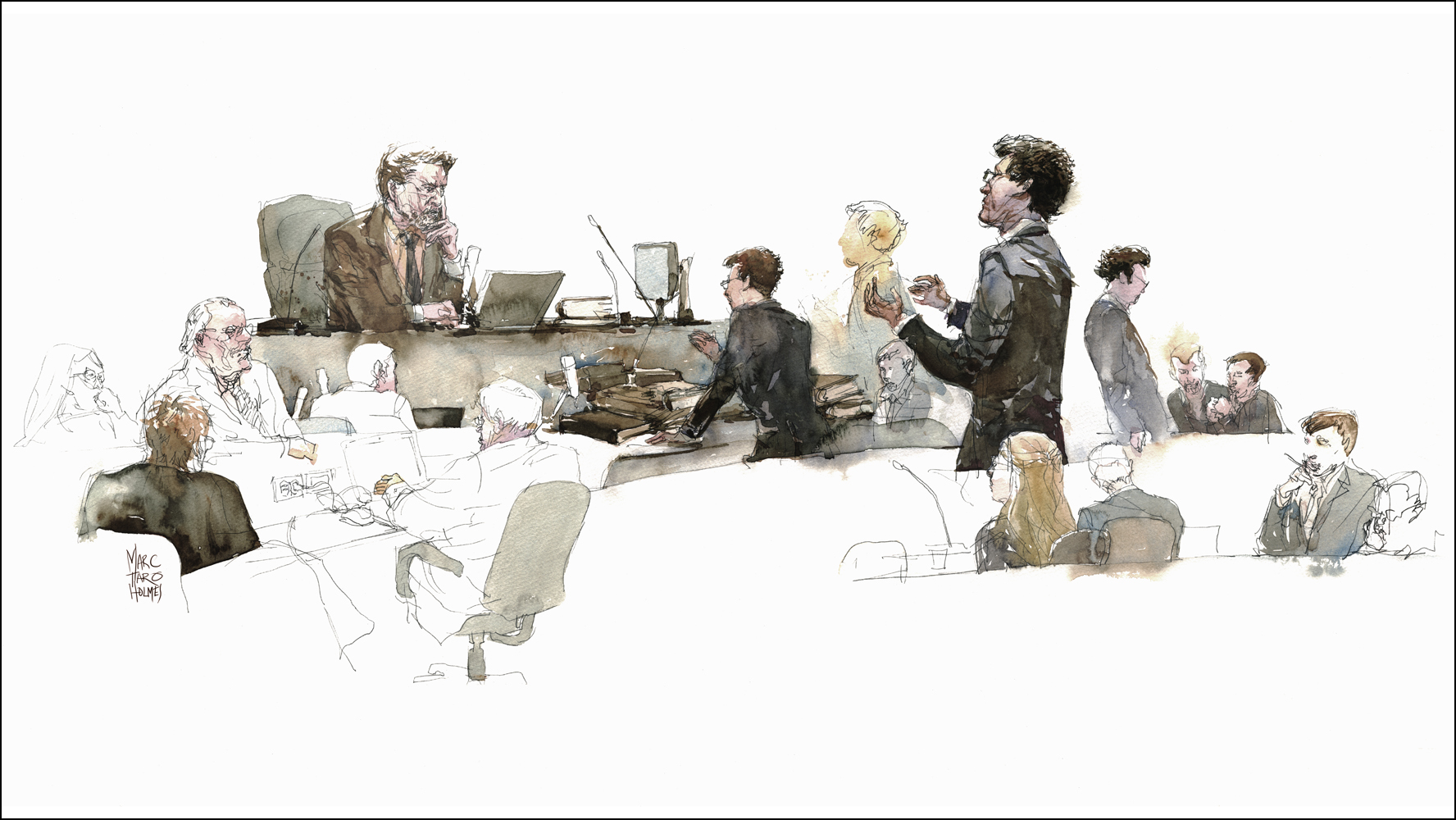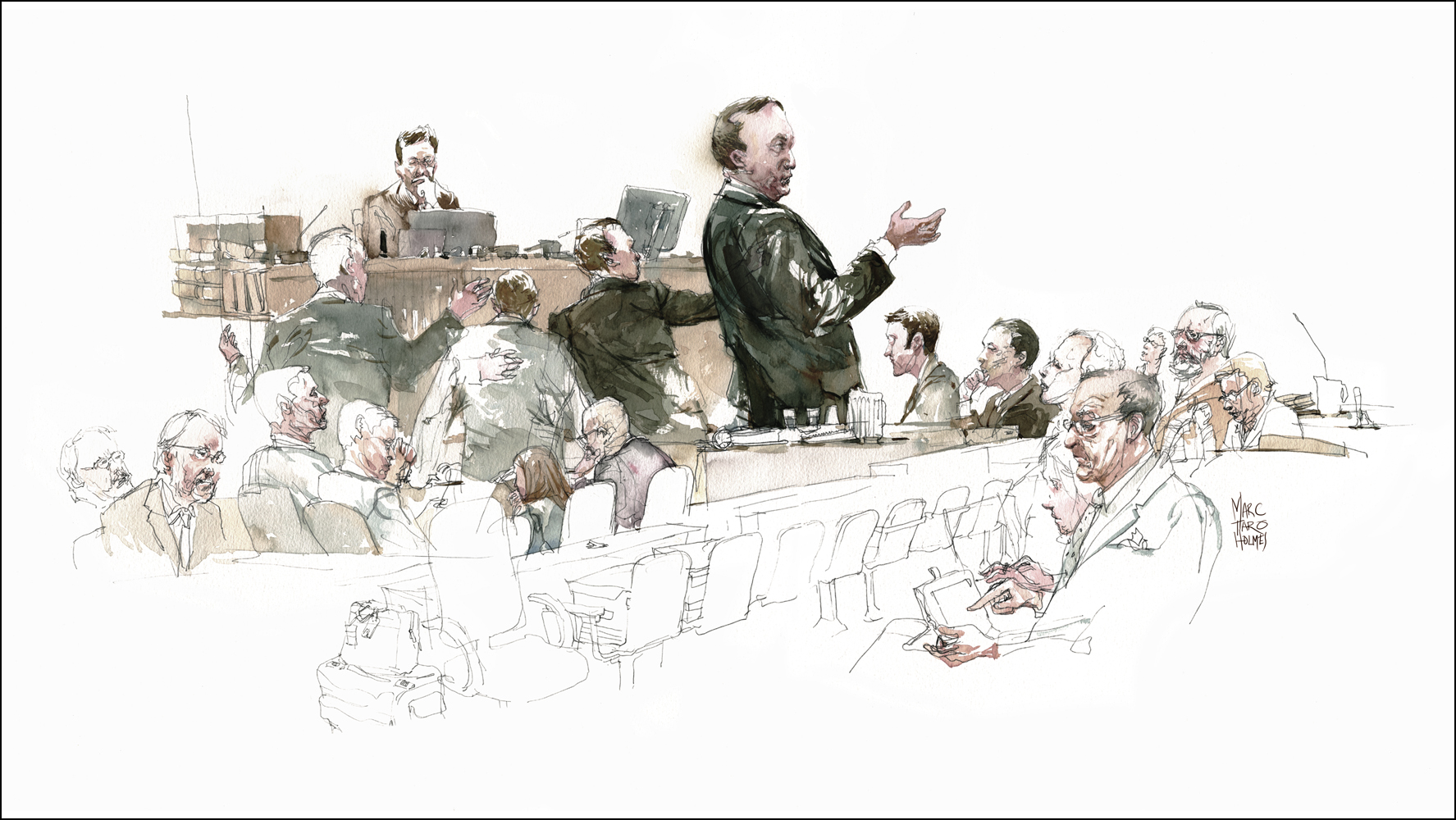 Marc, as an attorney for the past 34 years, I can tell you that cameras in the courtroom are one of the worst things ever to happen to the legal system and I much, much prefer courtroom artists, a rare, rare breed indeed. I applaud you and your work and your willingness to do this. And your work is amazing. I was also involved in what we lovingly called the tobacco wars which, in 1998 in the US, resulted in “the Master Settlement Agreement” which is still being argued over in the states. I was on the side of health– the state attorney generals office– and remained involved in various forms and various times up until my retirement last year. It is an absolutely fascinating mess, from all points of view, and I am not sure the legal system– American or Canadian– will ever see the like. But I digress. I love your work (and have some small paintings to prove it) and you have done great justice (pardon… I had to) to the great courtroom illustrators who were there before cameras entered the courtroom. I hope you will continue with courtroom illustration. Kudos again.– Doug Moench