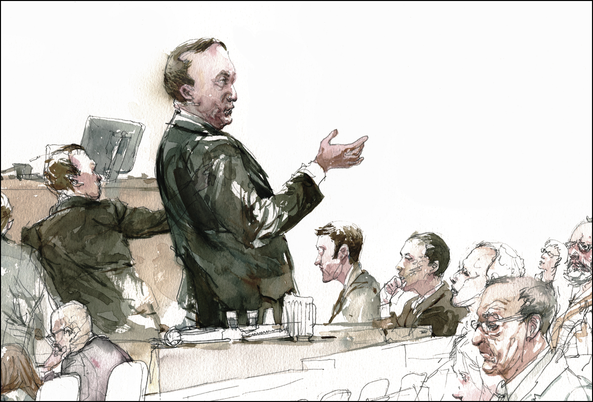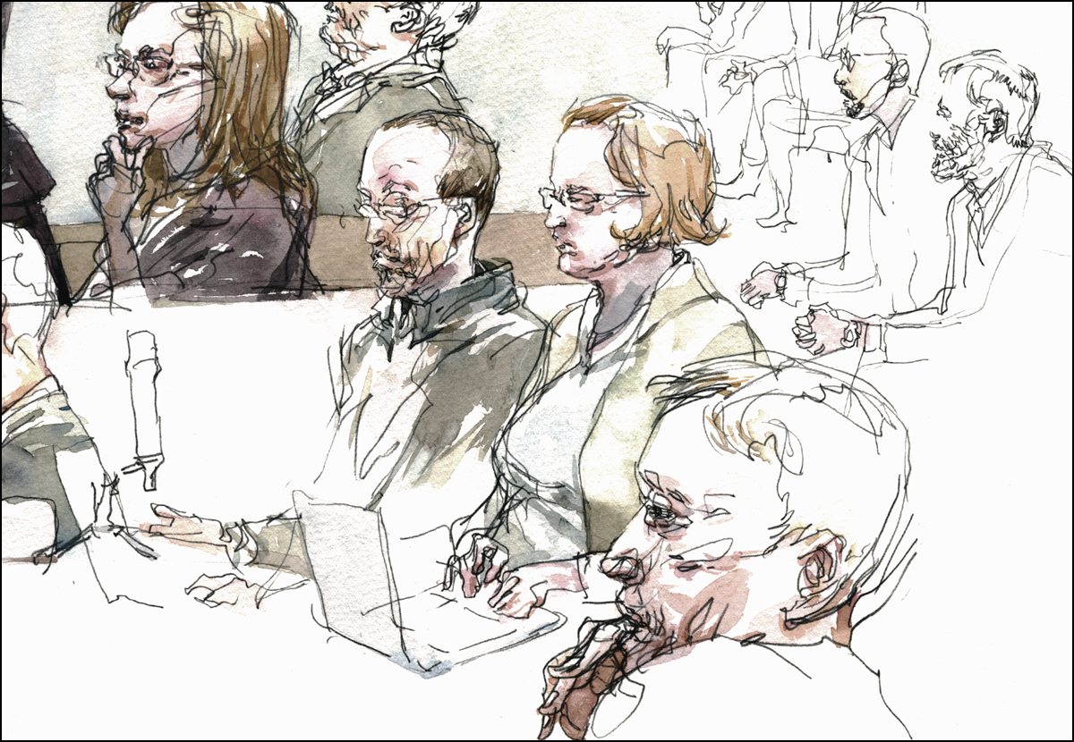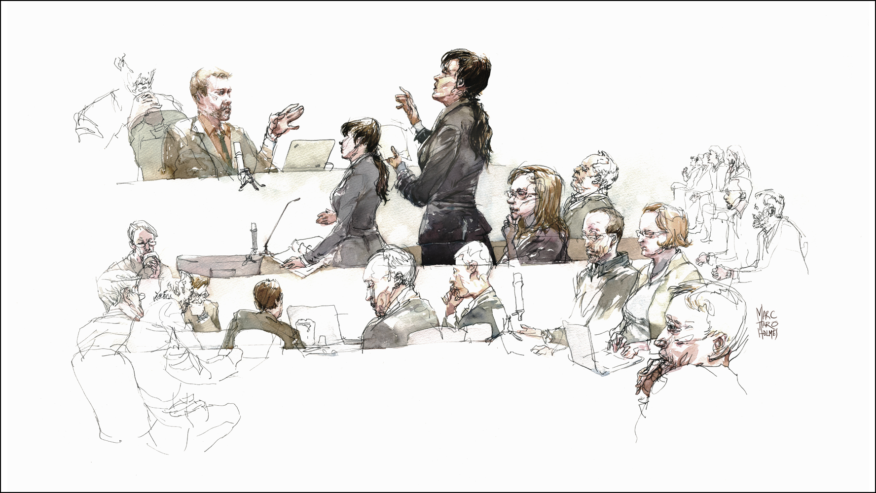 Dear Marc, I’ve been following your work for some time now and it’s nothing short of excellent!! I do have a technical question though. In these courtroom sketches, it seems as if the scale of the figures is inconsistent. There are figures in the foreground for instance that are smaller than the ones behind. Considering your skill, I’m wondering if this is purposeful.