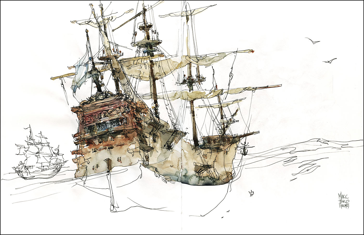 No major art-tips to say today, other than these are in a shiny new Stillman & Birn Epsilon Series Sketchbook (8.5 x11″). A smooth, lightweight paper – really a joy for a detailed pen drawing. I’ve avoided watersoluble ink this time – that darn rigging would just melt to nothing.