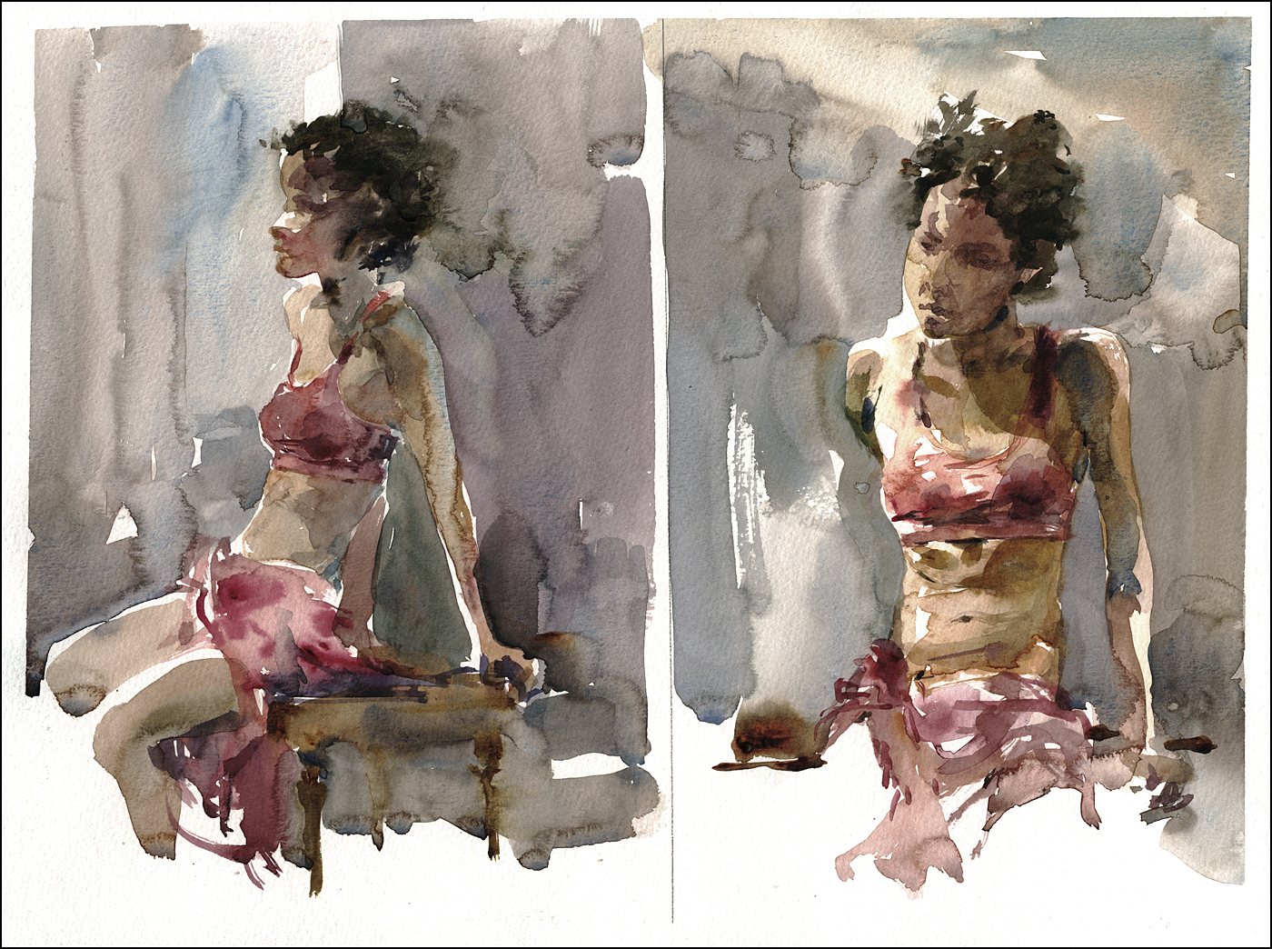 [Long pose session, these were half hour warmups. Watercolor, 12×16″]