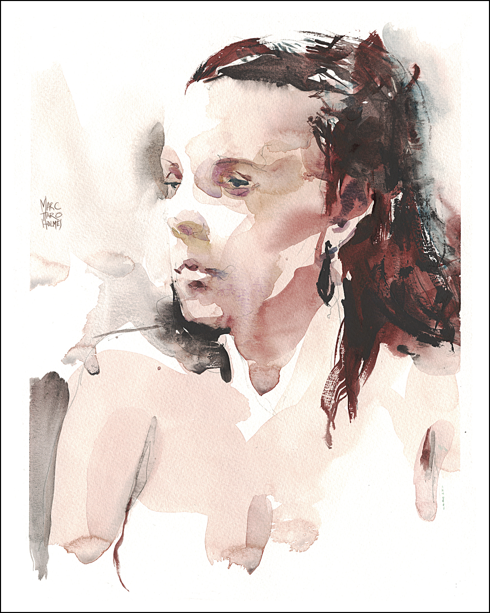 This sketch is almost entirely done with the one color, Perylene Maroon. Using with a bit of DS Bloodstone Genuine for the darks in the hair, maybe the lightest hint of DS Quinacridone Deep Gold under the nose and along the left eye (an accidental touch really) and one stroke of DS Mayan Blue Genuine at the back of the head.