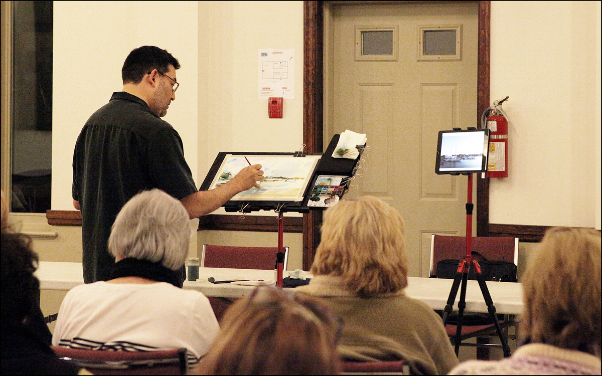 My demo was done from a snapshot taken on our recent trip to Florida. But honestly, as we’re just back from painting dozens of these views, it was from memory more than anything. My main goals in about an hour of talking and painting were to show the simultaneous Larger-to-Smaller, Light-to-Dark and Wet-to-Dry progress of a watercolor.
