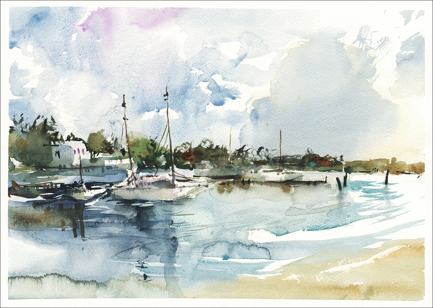 I start with what I call The Three Big Shapes. Sky and Ground (in this case Water), and ‘Everything Else’. The treeline, and all the boats and docks are simply left as a single negative shape at first, then in the second half of the painting, I come back into that long horizontal landscape, and create the shadows, masts, piers and other details that turn it into a marina.