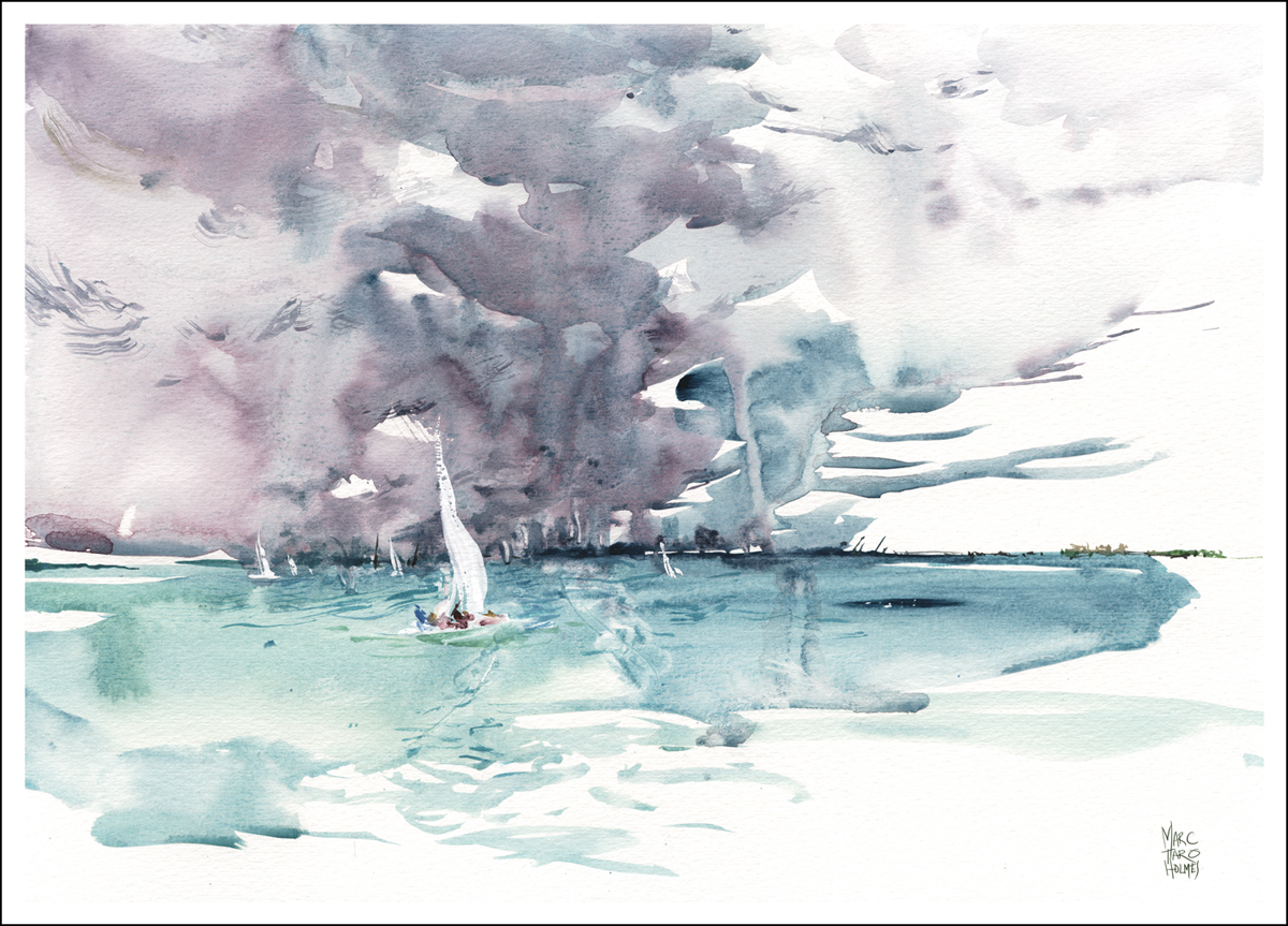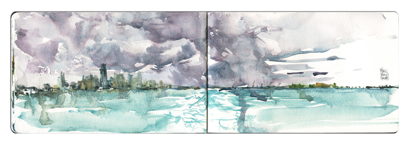 It was the last sketchbook drawing coming out of Miami that got me super excited. I wasn’t so inspired by all the pastel condominium towers as we passed through the city, but as we were pulling out, a great storm started forming. As the city receded into a dark band on the horizon, we passed through a flotilla of sailboats. I loved the look of their sails standing out against the sky. I was more than a little surprised to see them jauntily sailing around with that weather coming in. They’re clearly more confident that I was.