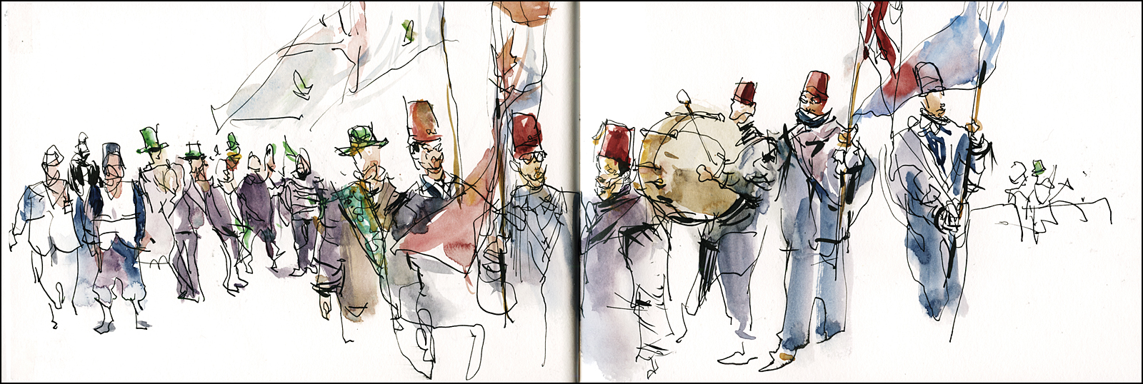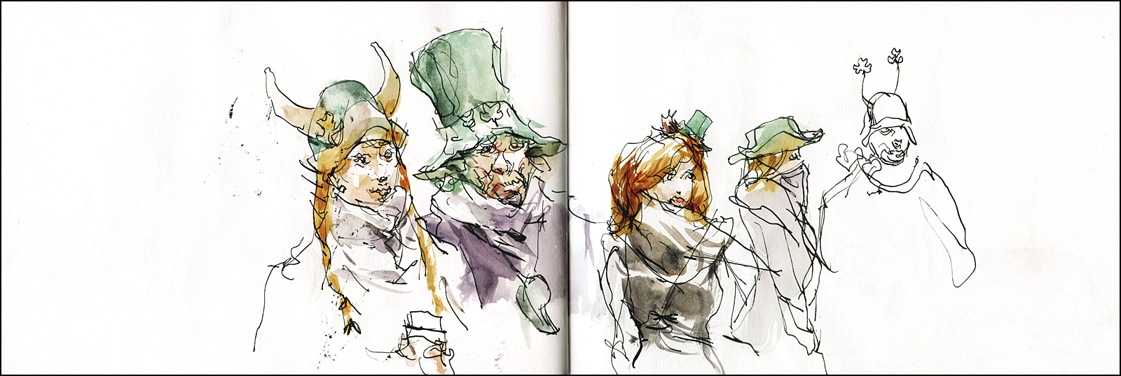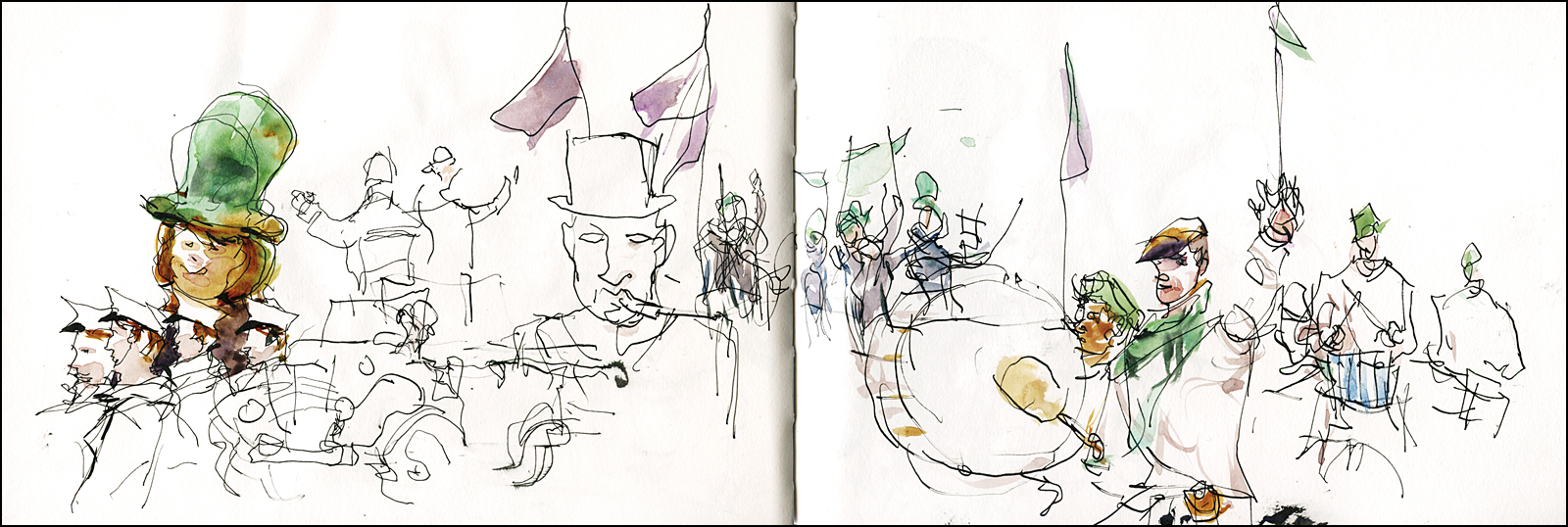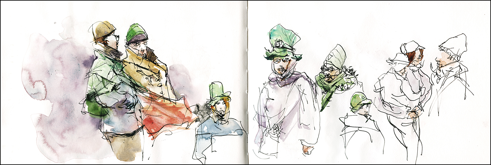 Just look at this sketch of the fellow wrapped in the Irish flag –  I think it’s one of my best drawings ever. You can’t make this kind of drawing at leisure. At home, in the studio, you just aren’t stressed enough to kick into ‘survival sketching mode’.