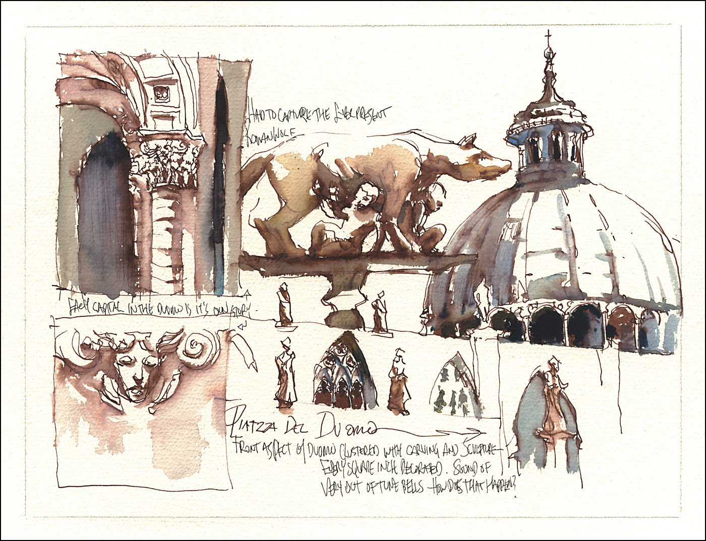 We got dropped off at the Plaza del Duomo and started by choosing a series of meeting points – circulating around a small area, and meeting at a visible landmark in an hour. So you could stick together if you wanted, or choose to have some alone-time with your sketchbook if you preferred. Either way, we’d be back together for the next leg of the tour.