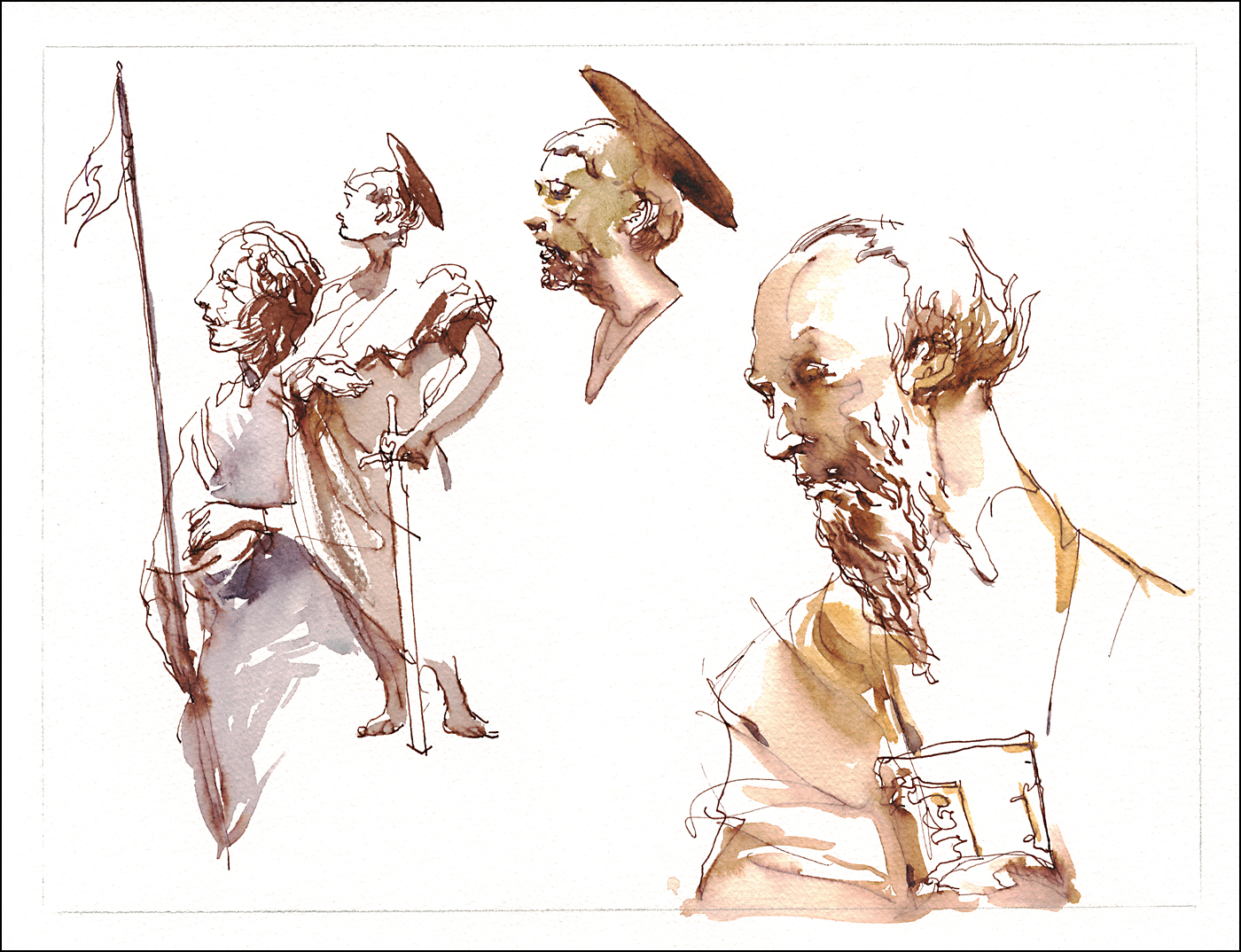 When I’m touring a new place, I like to alternate between the big picture, (street views or architectural portraits), smaller details of structures (carved ornaments and such), and the “human element” – which is sketching people whenever possible – or in the case when it’s all tourists and no interesting characters – then I’ll draw statues :)