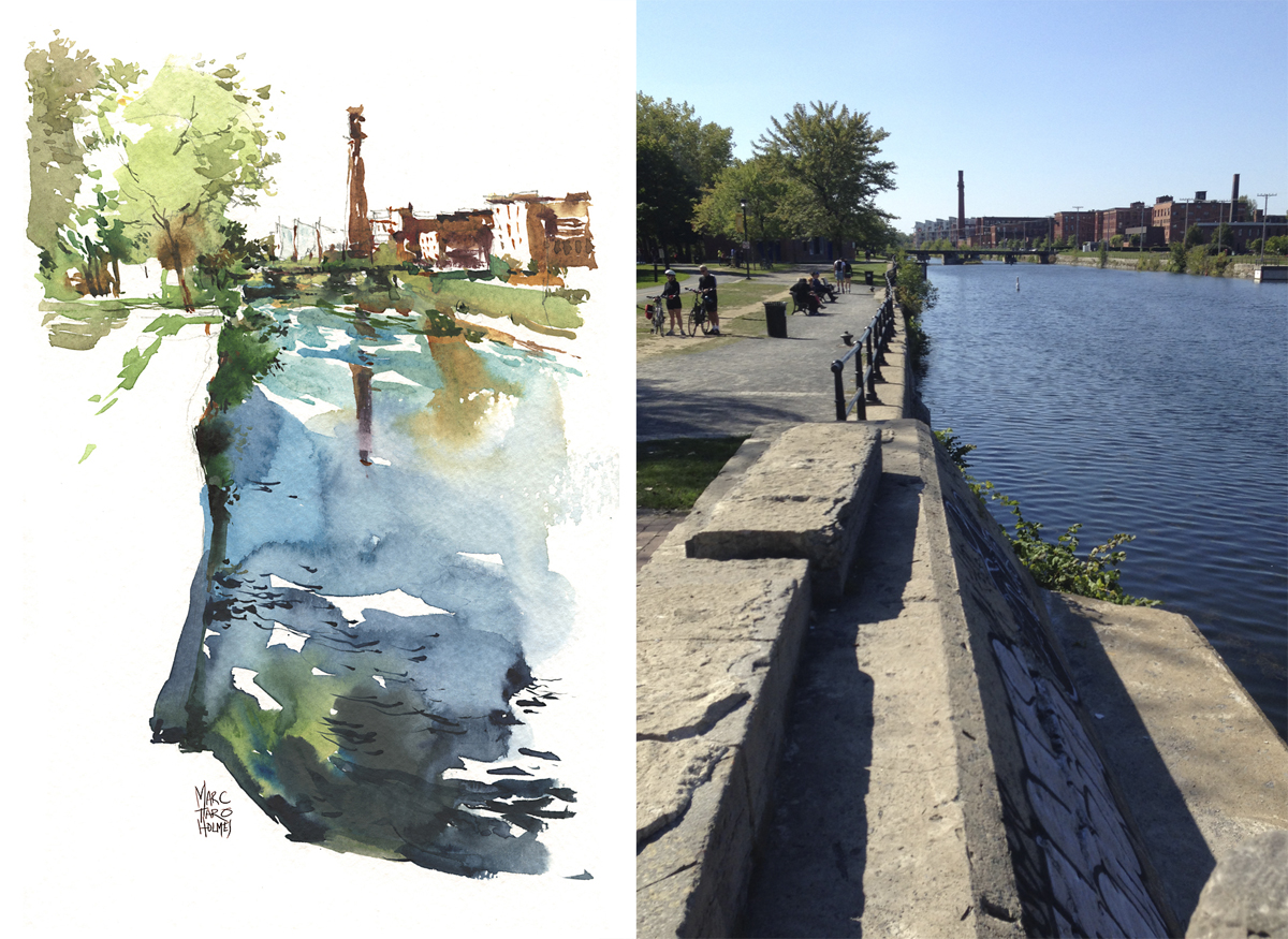 A view of the canal – in an unusual (for me) vertical composition, thanks to a suggestion from my friend Shari. We were sitting side by side. She sketched the view 90 degrees to mine.