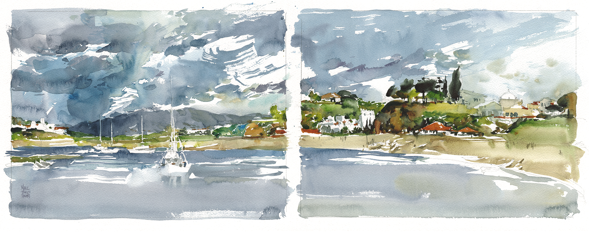 Some of the days I’d do a longer demo like this one above. This 11×30″ diptych is a view of Alvor harbor seen looking back from the boardwalk on the salt flats.