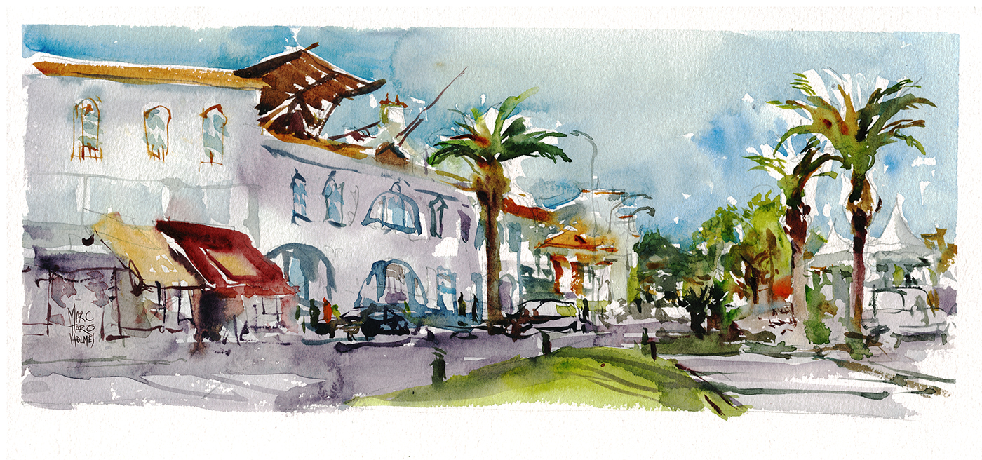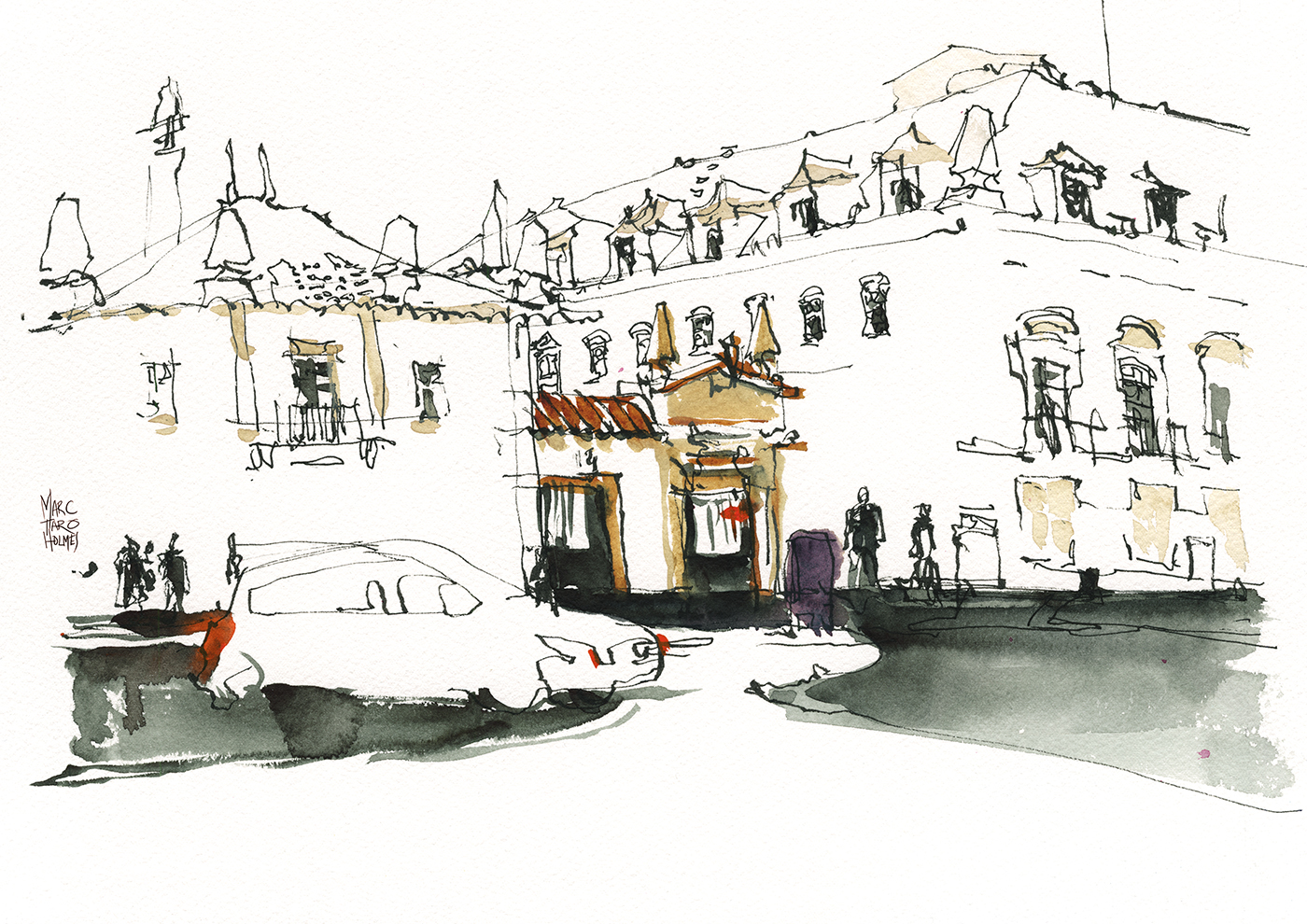 Painting these two sketches made me think back to the town of Paraty Brazil. We’d seen the Portuguese marble mosaic sidewalks show up in Macau, and now made the connection with the colorful plaster houses in Brazil. Real evidence the Portuguese once sailed the whole world.