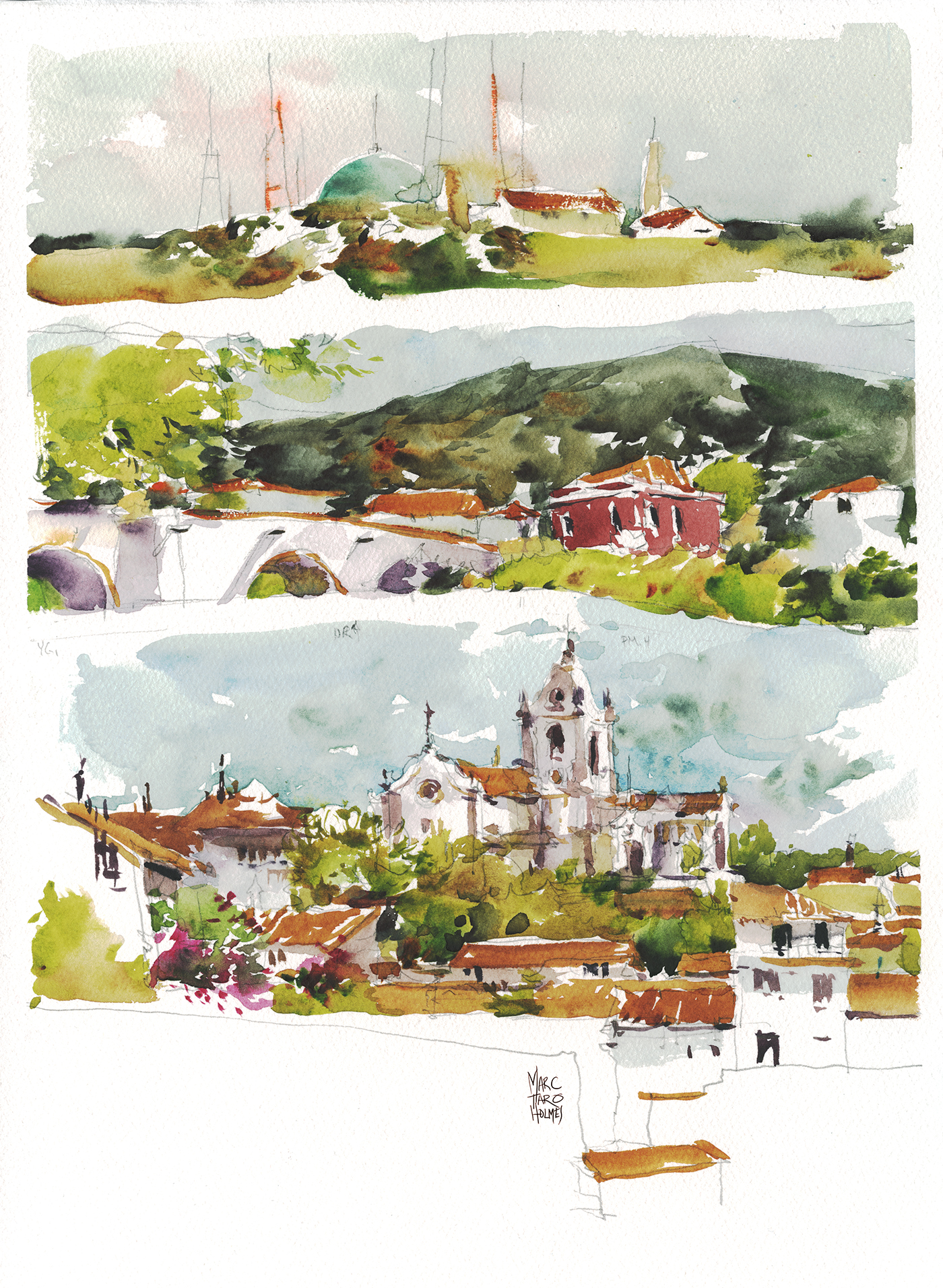 This final page starts at Fóia – the highest point of the Algarve, just above Monchique, then back down to Silves, where we got off the bus at this old bridge – then raced up to the cathedral to sketch it before we had to be back on the bus. Not the best way to be a sketch tourist – but this is the reality of travel – sometimes you have to draw fast, or not a all.