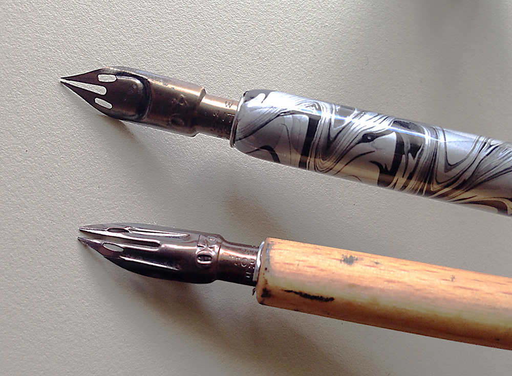 I bought these pen nibs over in Manchester. We popped into an excellent local store – who’s name I should have written down – (someone will remind me) (edit: H.Blyth and Co) – and I picked them up on a whim. I love the dual-line they make! Great for shading twice as fast with a dipping pen :)