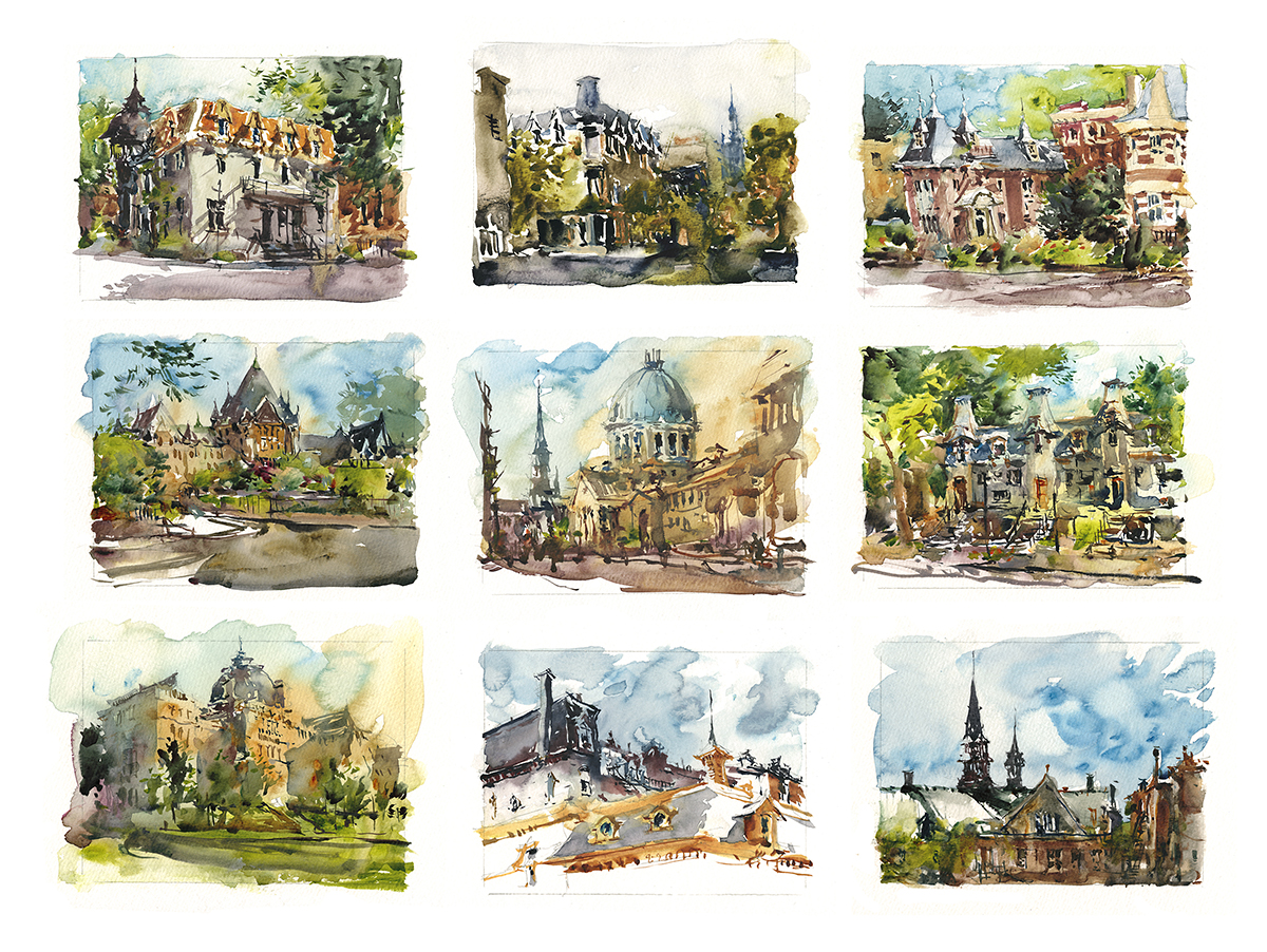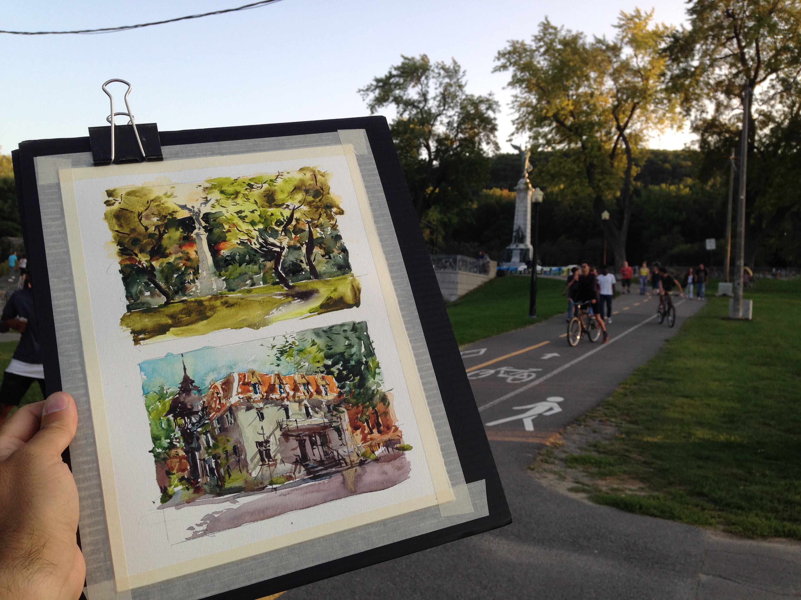 These little paintings are from a huge walk all the way across Montreal’s old port, then hopping the subway up to my old neighborhood on the Plateau. The sketches are approximately 5 x 6.5″ painted two-to-a-page on 9×12″ Canson Montval watercolor paper taped onto coroplast backing boards.