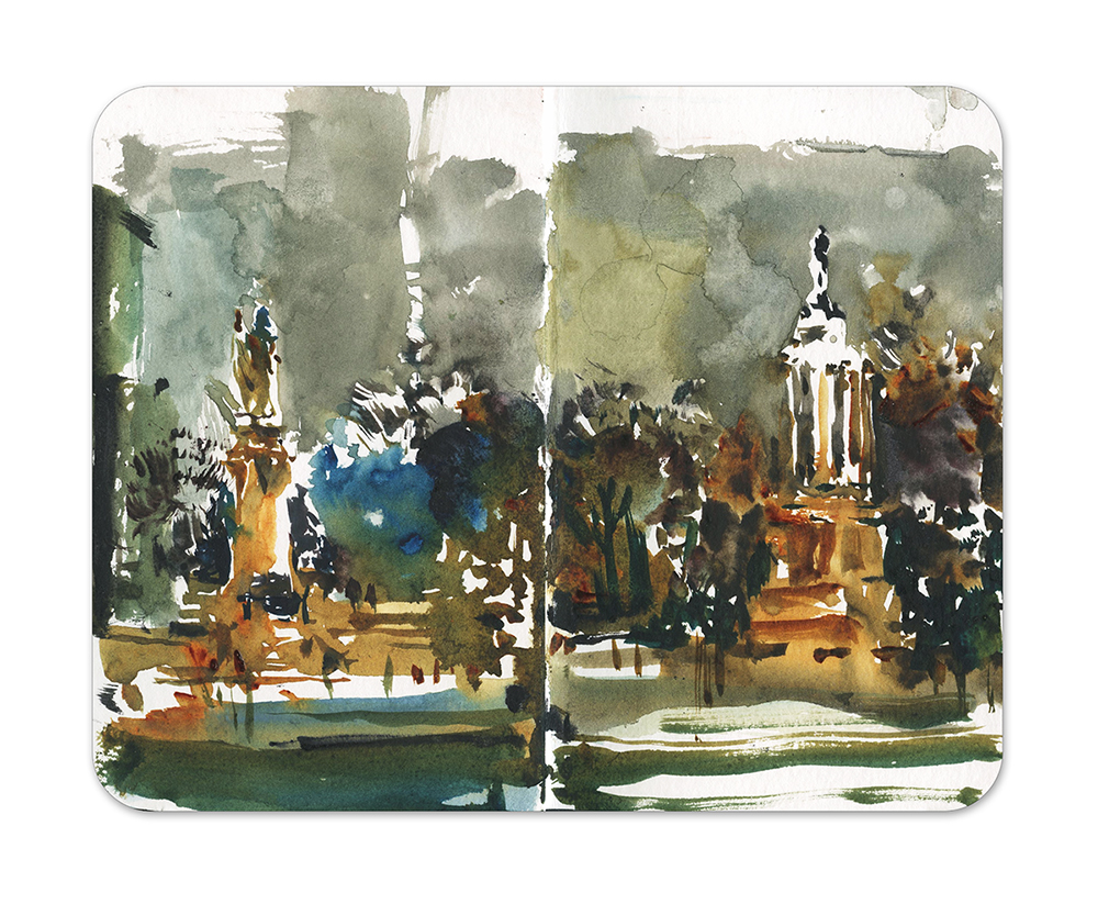 Round Two! Painting the monuments in Place Du Canada. It’s about zero Celsius right now, so no worries with freezing paint water. But it’s cold enough that I’m keeping this to a 15 min sketch. Walking to a coffee shop to dry paint takes longer than the painting itself.