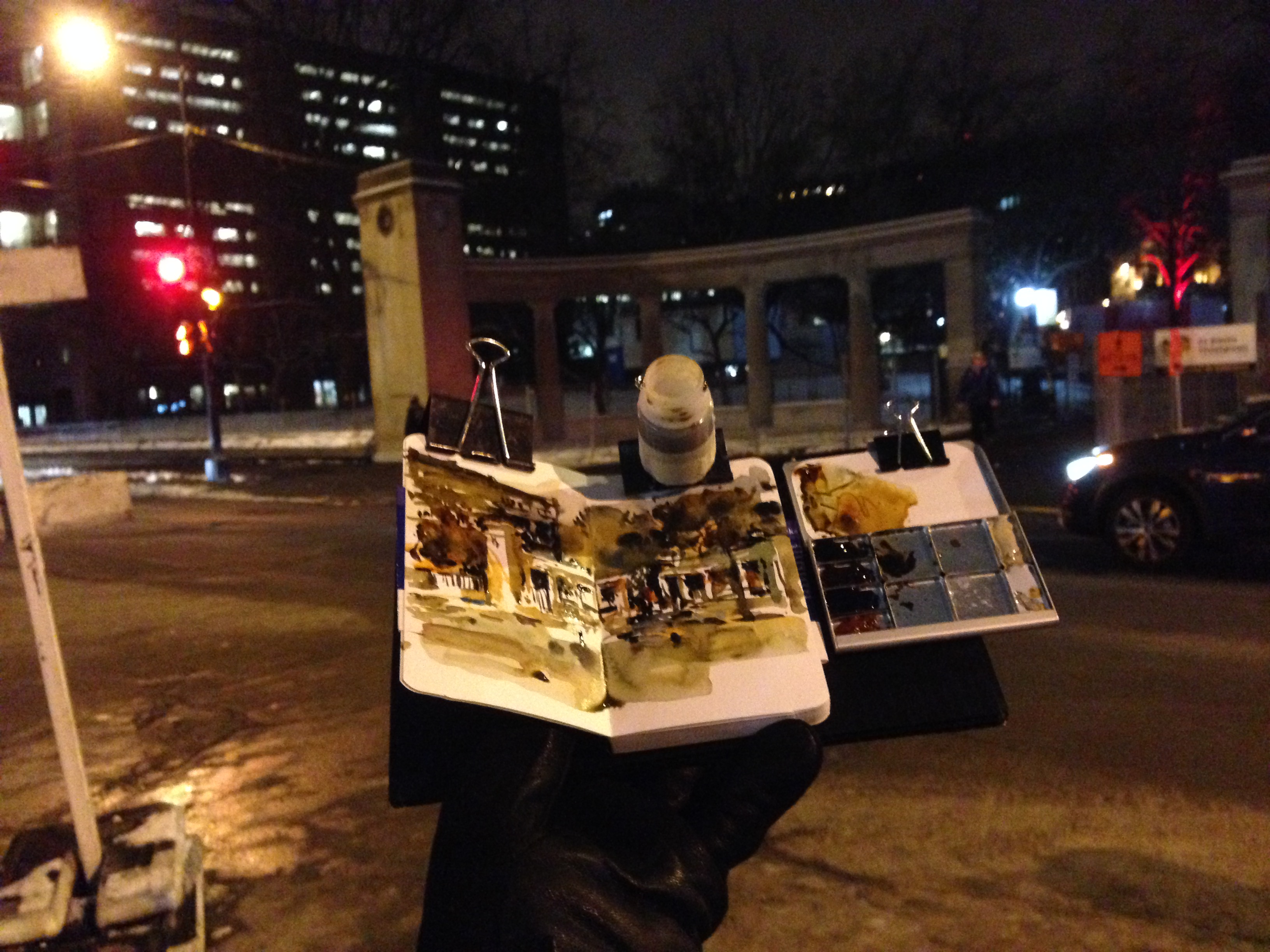 So I figured, if the pocket palette works for her, it should work on an arctic expedition of my own. I’m heading to downtown Montreal on a November night. Forecast says -3 Celsius! I want to try this thing out in the worst conditions possible. Dark, cold and tired – sketching doesn’t get more fun than that :)